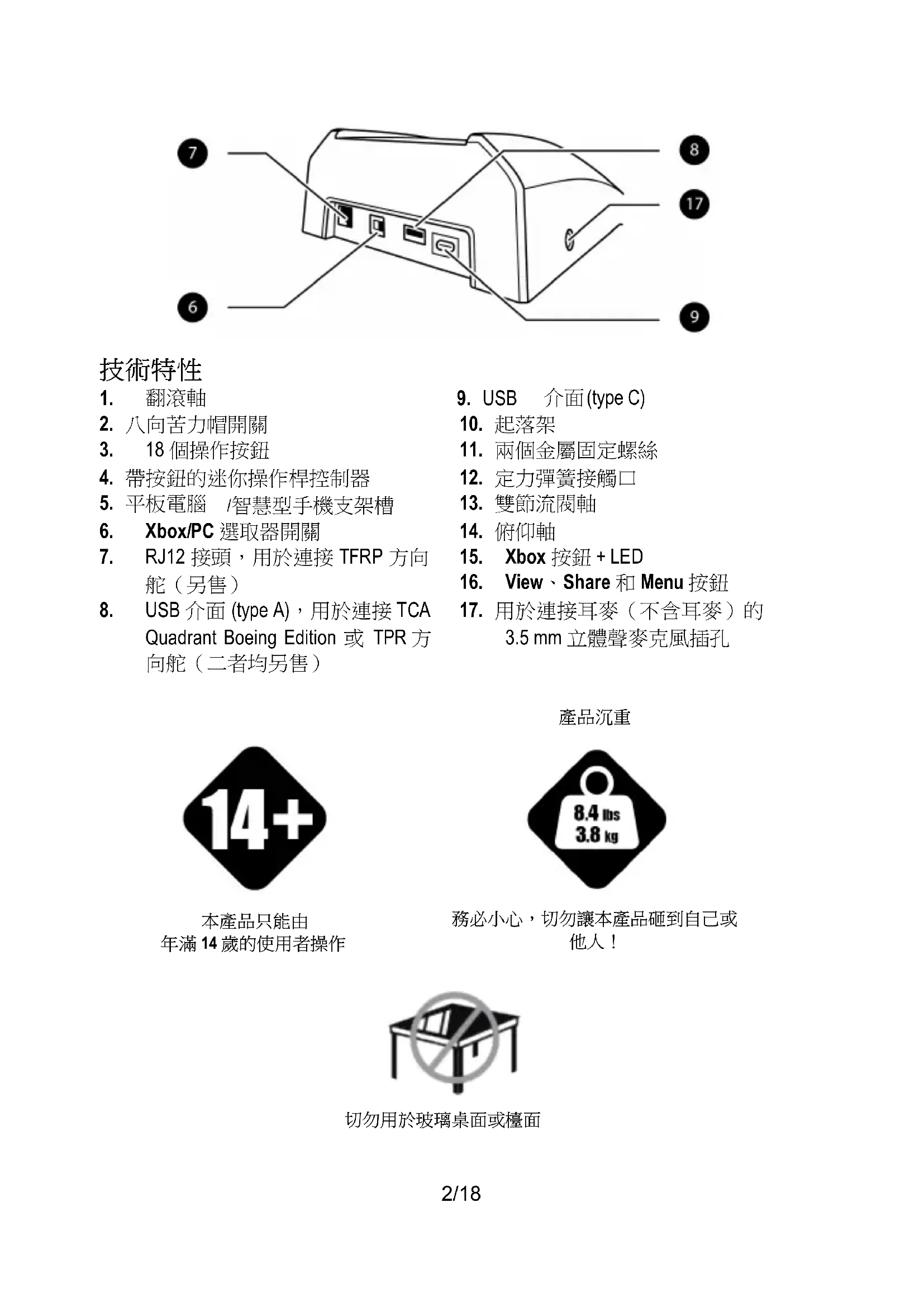 方便您輕鬆控制引擎推力。 用於連接耳麥(不含)的麥克風插孔 本飛行控制輪配有一個 3.5 mm 麥克風插孔 (17),以便您使用帶麥克風的耳 麥,從而獲得更具沉浸感的體驗。