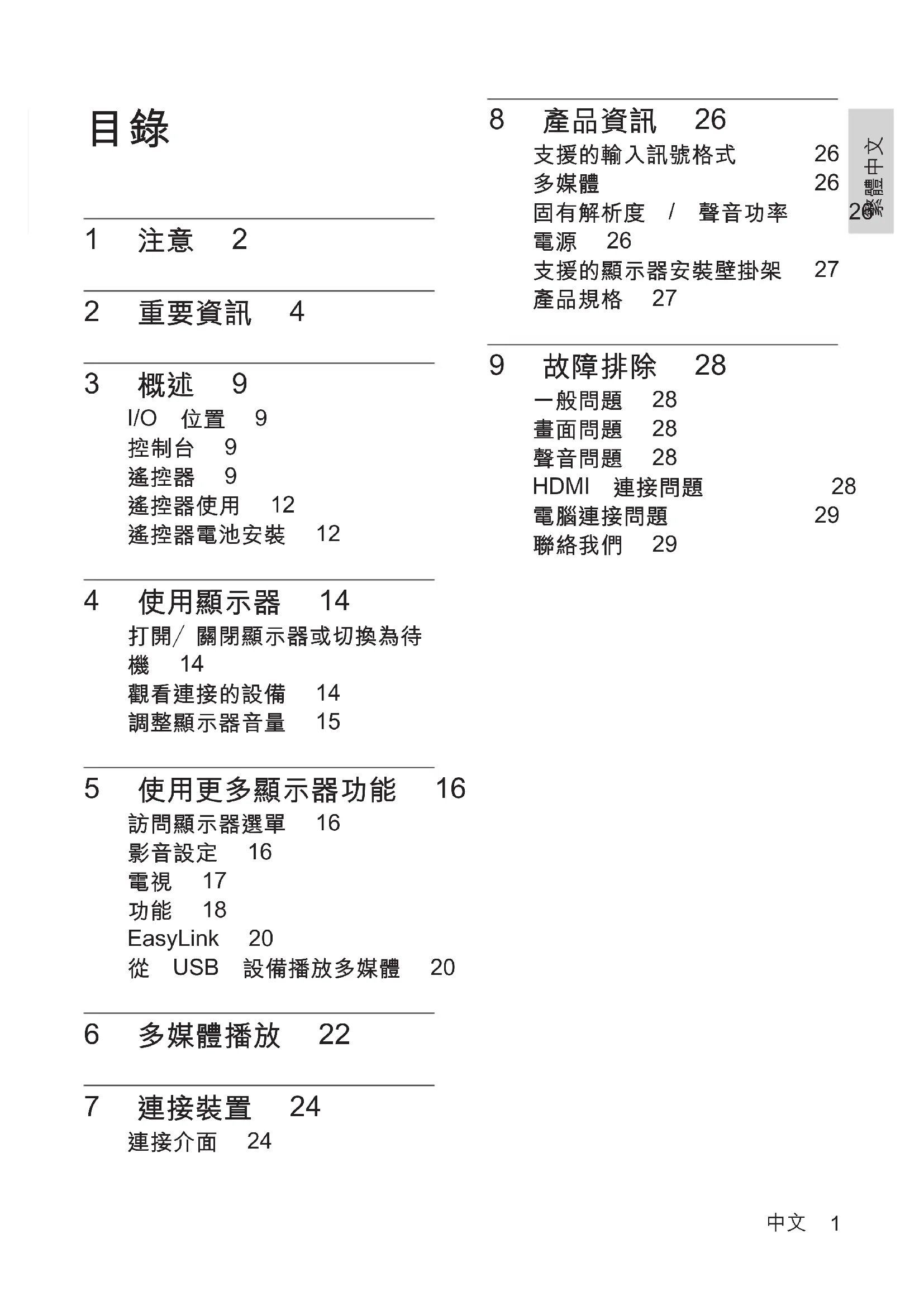 1 注意 2 2 重要資訊 4 3 概述 9 I/O 位置 9 控制台 9 遙控器 9 遙控器使用 12 遙控器電池安裝 12 4 使用顯示器 14 打開/關閉顯示器或切換為待 機 14 觀看連接的設備 14 調整顯示器音量 15 5 使用更多顯示器功能 16 訪問顯示器選單 16 影音設定 16 電視 17 功能 18 EasyLink 20 從 USB 設備播放多媒體 20 6 多媒體播放 22 7 連接裝置 24 連接介面 24 8 產品資訊 26 支援的輸入訊號格式 26 多媒體 26 固有解析度 / 聲音功率 26 電源 26 支援的顯示器安裝壁掛架 27 產品規格 27 9 故障排除 28 一般問題 28 畫面問題 28 聲音問題 28 HDMI 連接問題 28 電腦連接問題 29 聯絡我們 292