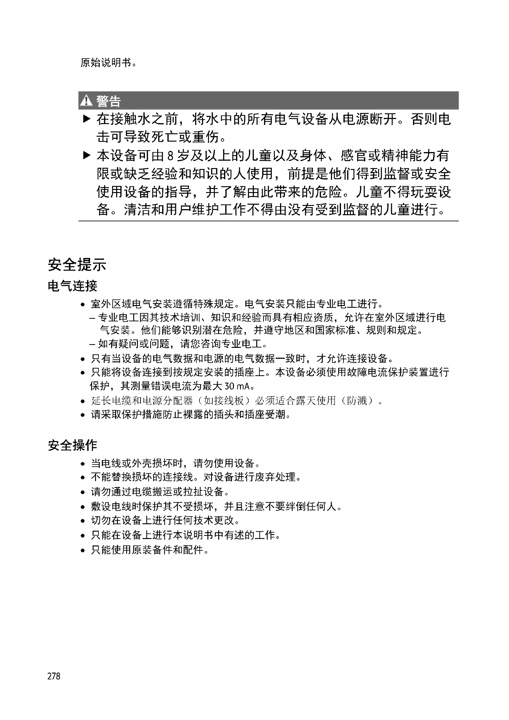 本设备可由 8 岁及以上的儿童以及身体、感官或精神能力有 限或缺乏经验和知识的人使用,前提是他们得到监督或安全 使用设备的指导,并了解由此带来的危险。儿童不得玩耍设 备。清洁和用户维护工作不得由没有受到监督的儿童进行。
