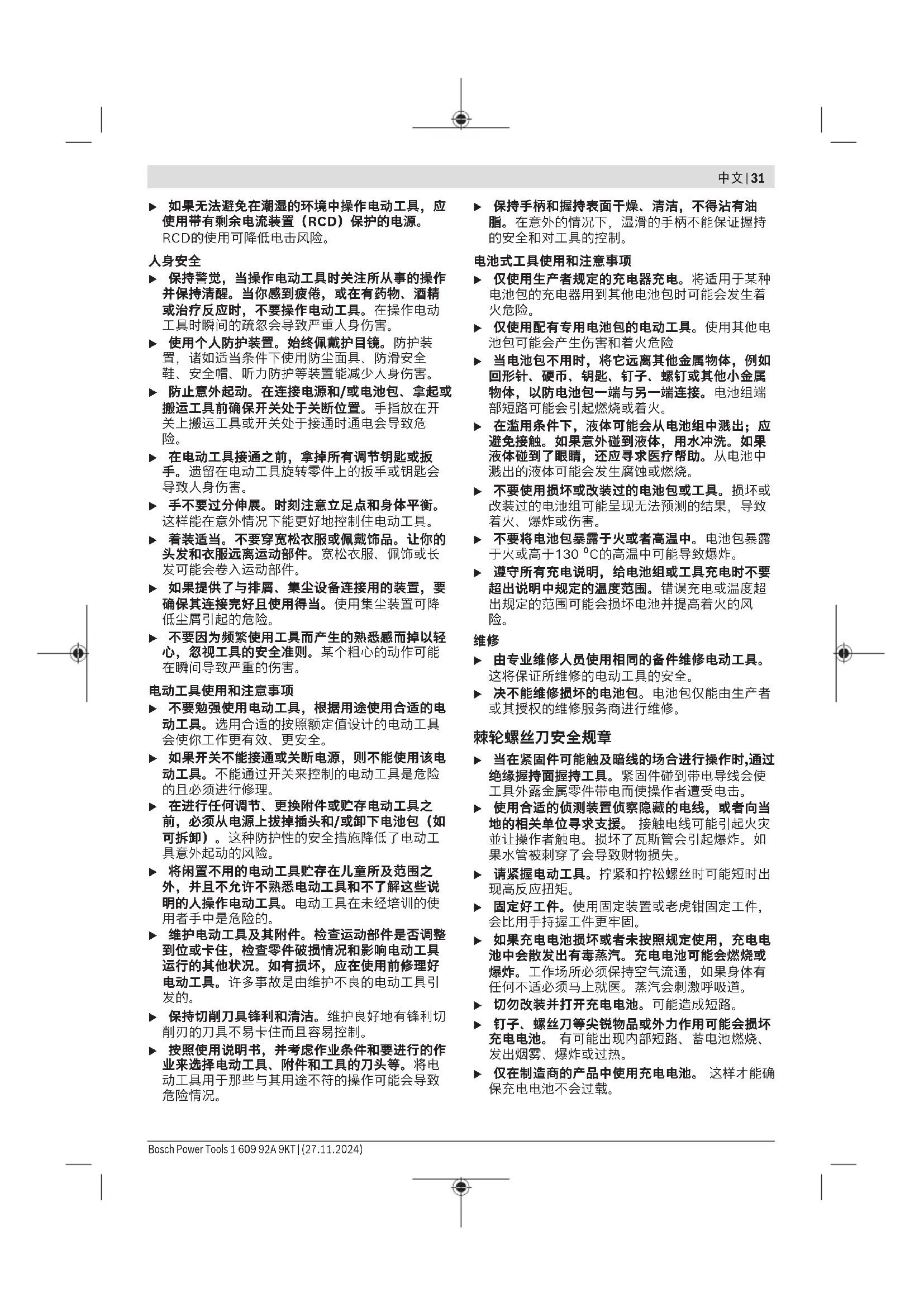 u 避免人体接触接地表面,如管道、散热片和冰 箱。如果你身体接触接地表面会增加电击风险。 u 不得将电动工具暴露在雨中或潮湿环境中。水进 入电动工具将增加电击风险。 u 不得滥用软线。绝不能用软线搬运、拉动电动工 具或拔出其插头。使软线远离热源、油、锐边或 运动部件。受损或缠绕的软线会增加电击风险。 u 当在户外使用电动工具时,使用适合户外使用的 延长线。适合户外使用的电线将降低电击风险。 1 609 92A 9KT | (27.11.2024) Bosch Power Tools中文 | 31 u 如果无法避免在潮湿的环境中操作电动工具,应 使用带有剩余电流装置(RCD)保护的电源。 RCD的使用可降低电击风险。