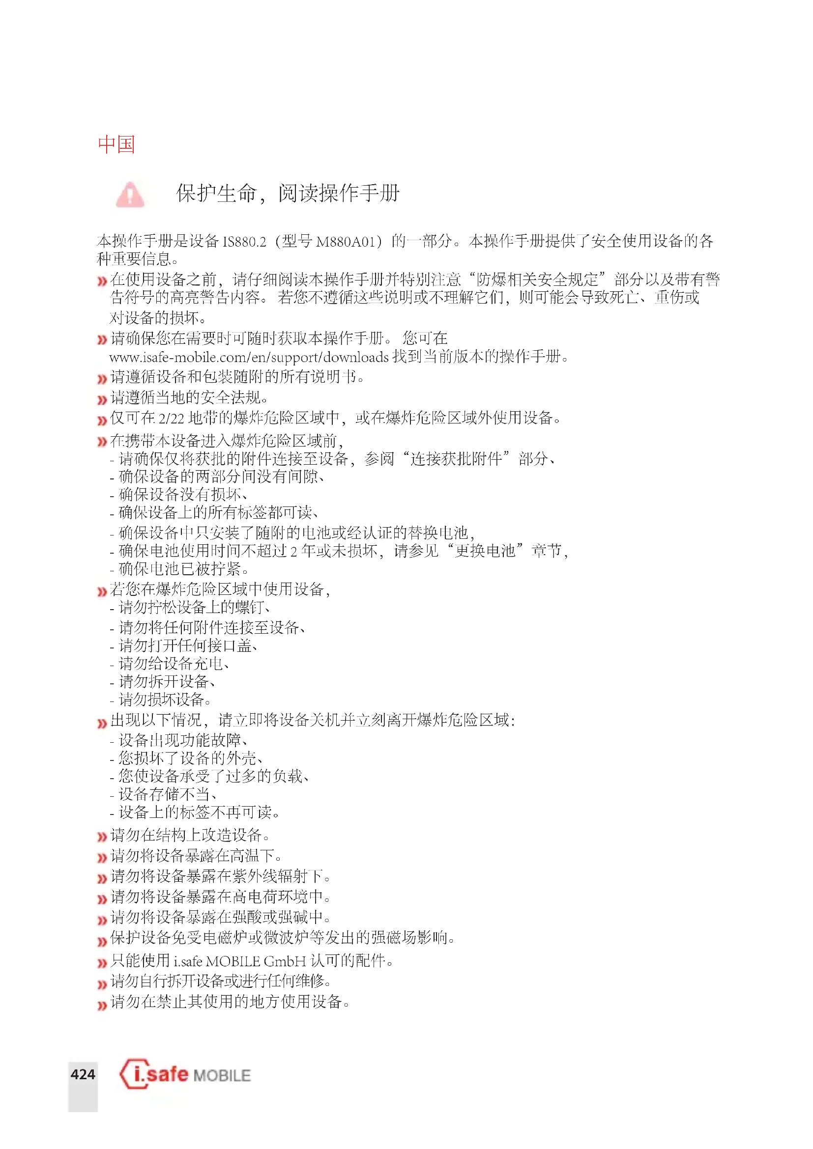 请确保您在需要时可随时获取本操作手册。 您可在 www.isafe-mobile.com/en/support/downloads 找到当前版本的操作手册。 请遵循设备和包装随附的所有说明书。 请遵循当地的安全法规。 仅可在 2/22 地带的爆炸危险区域中,或在爆炸危险区域外使用设备。 在携带本设备进入爆炸危险区域前, - 请确保仅将获批的附件连接至设备,参阅“连接获批附件”部分、 - 确保设备的两部分间没有间隙、 - 确保设备没有损坏、 - 确保设备上的所有标签都可读、 - 确保设备中只安装了随附的电池或经认证的替换电池, - 确保电池使用时间不超过 2 年或未损坏,请参见“更换电池”章节, - 确保电池已被拧紧。 若您在爆炸危险区域中使用设备, - 请勿拧松设备上的螺钉、 - 请勿将任何附件连接至设备、 - 请勿打开任何接口盖、