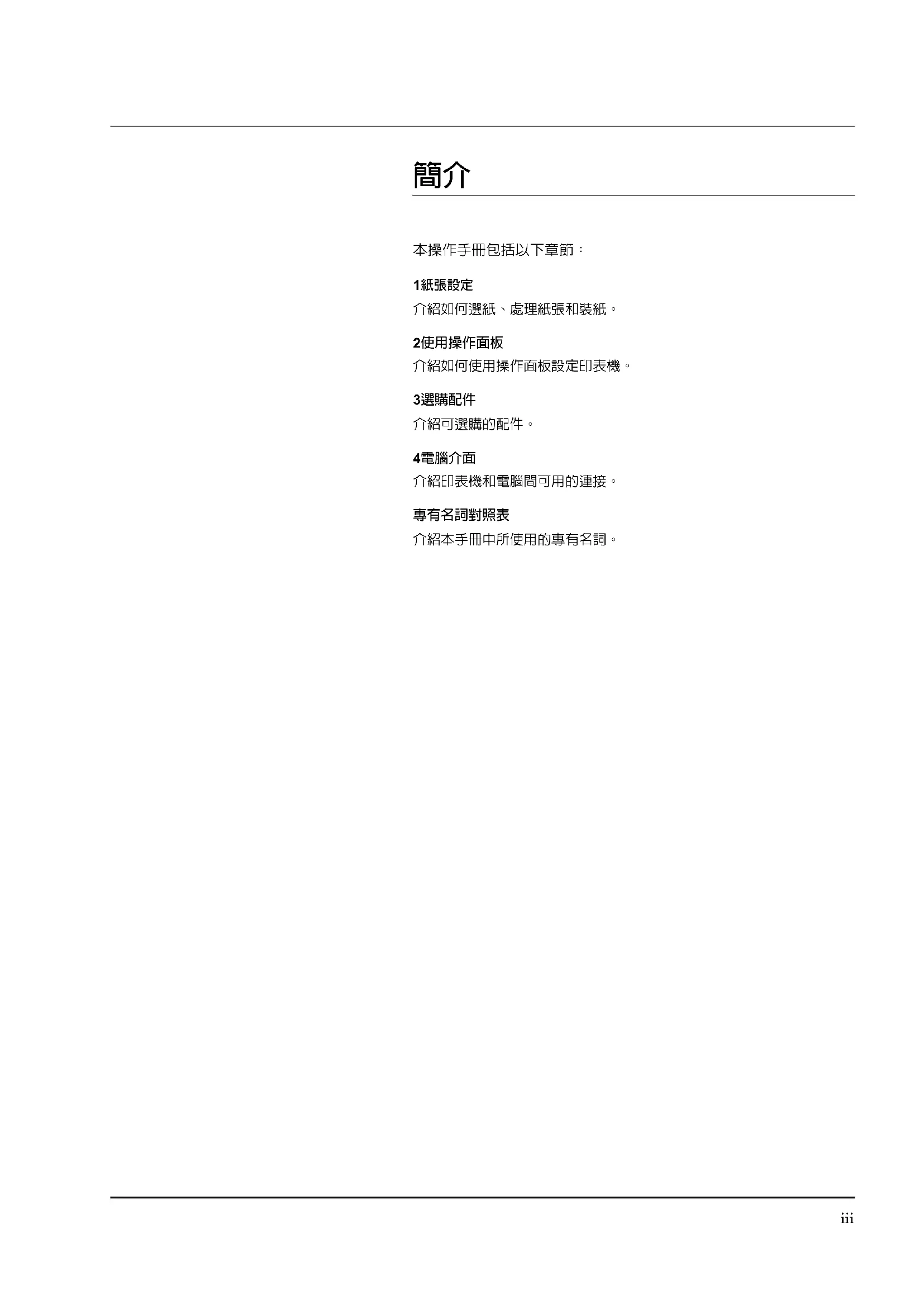 本操作手冊包括以下章節: 1 紙張設定 介紹如何選紙、處理紙張和裝紙。 2 使用操作面板 介紹如何使用操作面板設定印表機。 3 選購配件