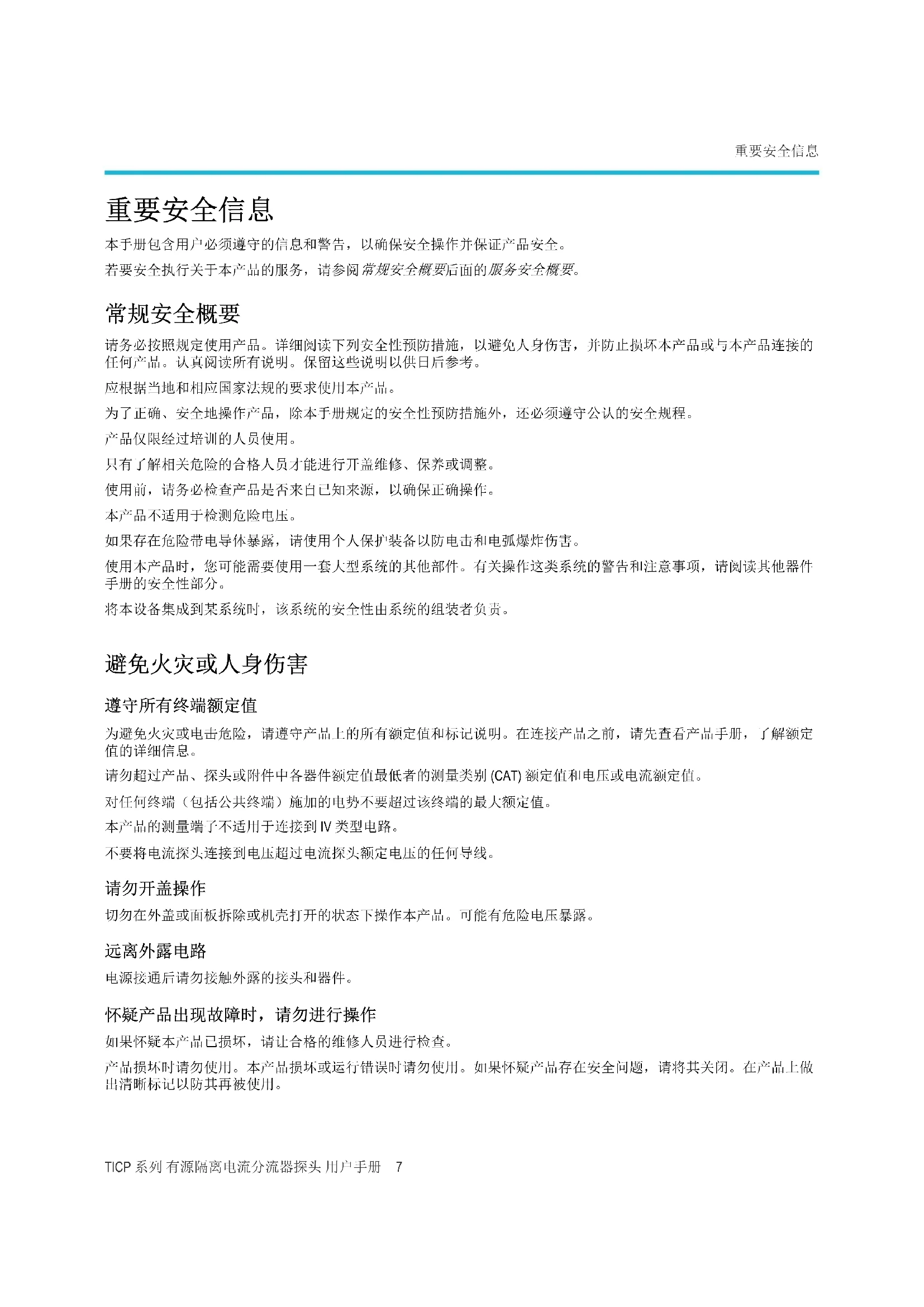 TICP 系列 有源隔离电流分流器探头 用户手册 7在使用之前,请检查电压探头、测试导线和附件是否有机械损坏,如损坏则予以更换。如果探头或测试导线损坏、 金属外露或出现磨损迹象,请勿使用。 在使用之前请先检查产品外表面。查看是否有裂纹或缺失部件。 仅使用规定的替换部件。