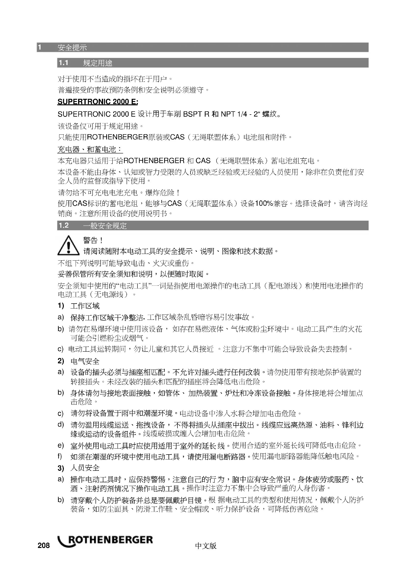 本充电器只适用于给ROTHENBERGER 和 CAS (无绳联盟体系)蓄电池组充电。 本设备不能由身体、认知或智力受限的人员或缺乏经验或无经验的人员使用,除非在负责他们安 全人员的监督或指导下使用。 请勿给不可充电电池充电。爆炸危险! 使用CAS标识的蓄电池组,能够与CAS(无绳联盟体系)设备100%兼容。选择设备时,请咨询经 销商。注意所用设备的使用说明书。