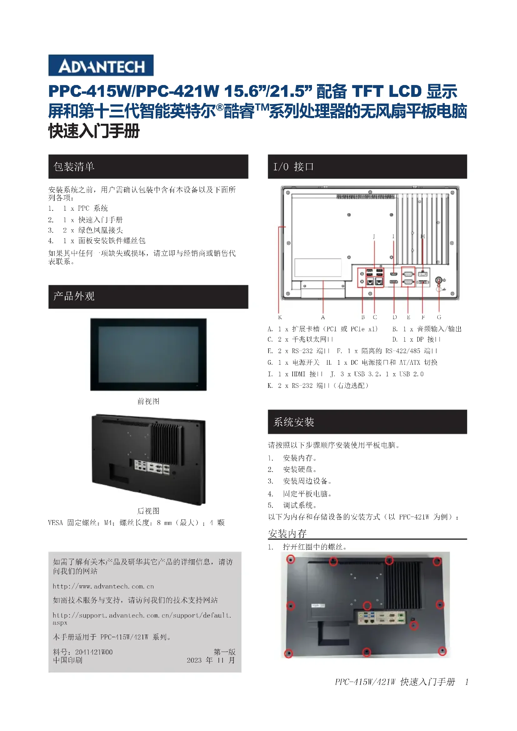 A. 1 x 扩展卡槽(PCI 或 PCIe x1) B. 1 x 音频输入/输出C. 2 x 千兆以太网口 D. 1 x DP 接口E. 2 x RS-232 端口 F. 1 x 隔离的 RS-422/485 端口G. 1 x 电源开关 H. 1 x DC 电源接口和 AT/ATX 切换I. 1 x HDMI 接口 J. 3 x USB 3.2,1 x USB 2.0K. 2 x RS-232 端口(右边选配)请按照以下步骤顺序安装使用平板电脑。1. 安装内存。2. 安装硬盘。3. 安装周边设备。4. 固定平板电脑。5. 调试系统。以下为内存和存储设备的安装方式(以 PPC-421W 为例):