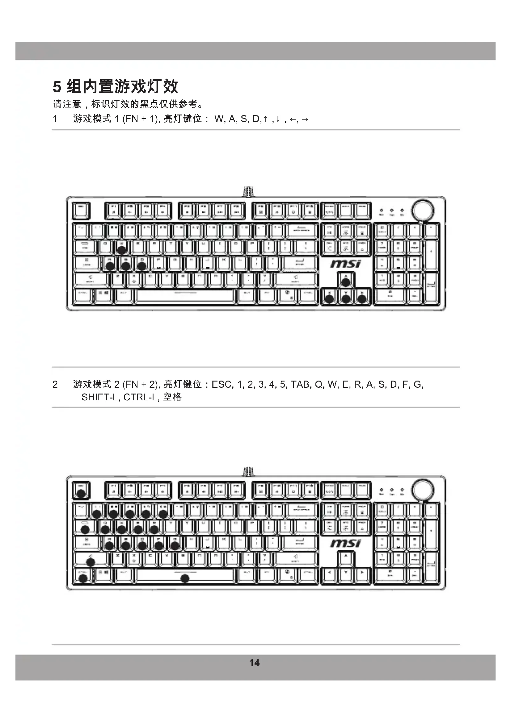 1 磁性上盖 2 指示灯 3 旋钮 4 支架 5 脚垫 6 侧面灯条14 5 组内置游戏灯效 请注意,标识灯效的黑点仅供参考。 1 游戏模式 1 (FN + 1), 亮灯键位: W, A, S, D,↑ ,↓ , ←, → 2 游戏模式 2 (FN + 2), 亮灯键位:ESC, 1, 2, 3, 4, 5, TAB, Q, W, E, R, A, S, D, F, G, SHIFT-L, CTRL-L, 空格14 15 3 游戏模式 3 (FN + 3), 亮灯键位:ESC, ~, 1, 2, 3, 4, 5, TAB, Q, W, E, P, A, S, D, F, G, V, B, CTRL-L, 空格 4 游戏模式 4 (FN + 4)(默认情况下),亮灯键位:W, A, S, D,↑ ,↓ , ←, → 5 游戏模式 5 (FN + 5)(默认情况下),亮灯键位:W, A, S, D,↑ ,↓ , ←, →16