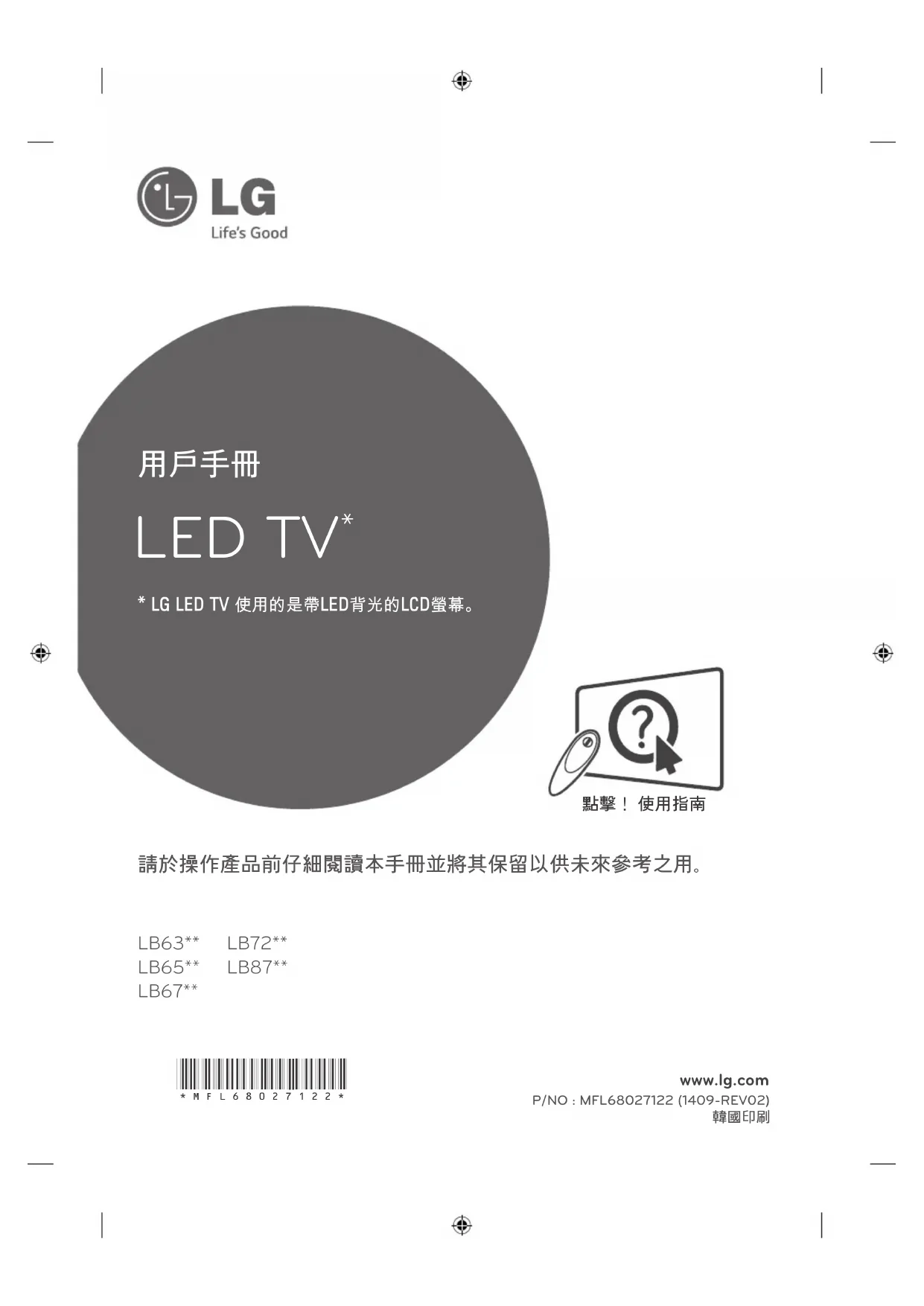 請於操作產品前仔細閱讀本手冊並將其保留以供未來參考之用。 LB63**LB65**LB67**LB72**LB87**www.lg.comP/NO : MFL68027122 (1409-REV02)