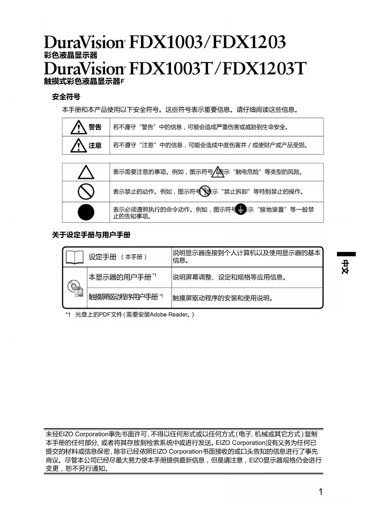 触摸屏驱动程序的安装和使用说明。 *1 光盘上的PDF文件(需 要 安 装 Adobe Reader。) 未经EIZO Corporation事先书面许可,不得以任何形式或以任何方式(电子、机械或其它方式)复制 本手册的任何部分、或者将其存放到检索系统中或进行发送。EIZO Corporation没有义务为任何已 提交的材料或信息保密,除非已经依照EIZO Corporation书面接收的或口头告知的信息进行了事先 商议。尽管本公司已经尽最大努力使本手册提供最新信息,但是请注意,EIZO显示器规格仍会进行 变更,恕不另行通知。2