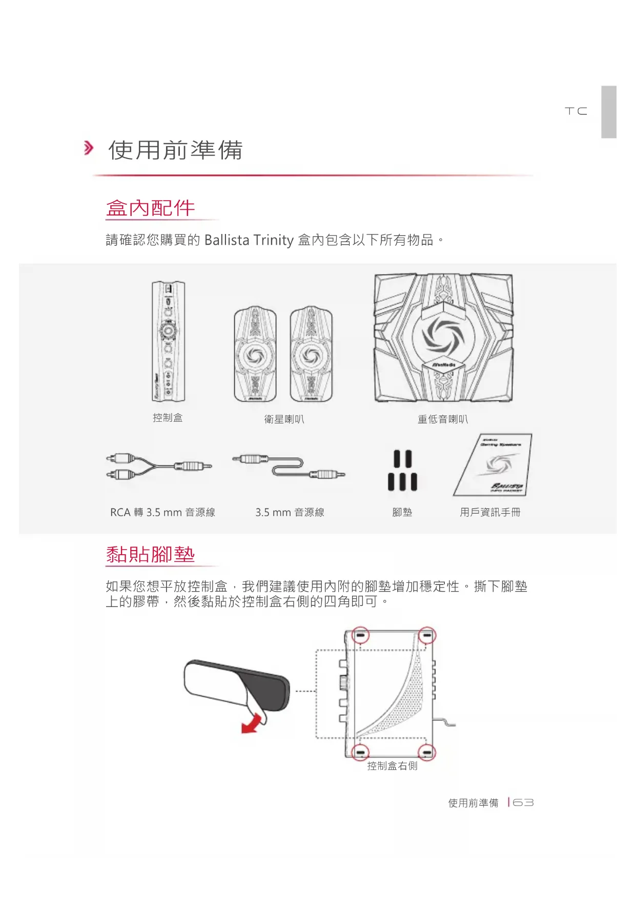 控制盒背面連接衛星喇叭、重低音喇叭、以及電腦音源到控制盒上。1. 將控制盒接上電源2. 按下電源鍵開啟您的 3. Ballista Trinity