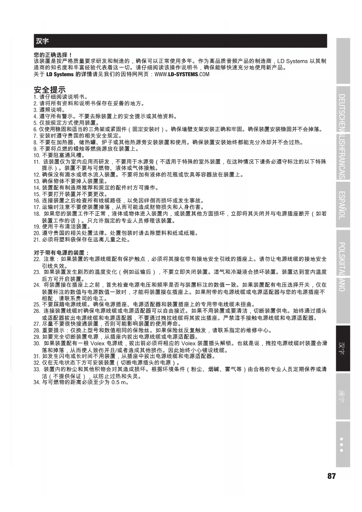 24.將設備接在插座上之前,首先檢查電源電壓和頻率是否與設備標注的數值一致。如果設備配有電壓選擇開關,僅在 設備標注的數值與電源數值一致時,才能將設備接在插座上。如果附帶的電源線纜或電源適配器與您的電源插座不相 配,請聯絡貴司的電工。 25.不要踩踏電源線纜。確保電源插座、電源適配器和設備插座上的專用帶電線纜未扭曲。 26.連接設備線纜時確保電源線纜或電源適配器可以自由接近。如果不用設備或要清潔,切斷設備供電。始終透過插頭 或適配器拔出電源線纜和電源適配器,不要透過拽拉線纜將其拔出插座。嚴禁濕手接觸電源線纜和電源適配器。 27.儘量不要很快接通設備,否則可能影響設備的使用壽命。 28.重要提示:僅換上型號和數值相同的保險絲。如果保險絲反復觸發,請聯絡指定的維修中心。 29.如要完全切斷設備電源,從插座內拔出電源線纜或電源適配器。 30.如果設備配有一根Volex電源線,拔出前必須將相應的Volex設備插頭解鎖。也就是說,拽拉電源線纜時設備會滑 落和掉落,從而使人致傷並且/或者造成其他損傷。因此始終小心鋪設線纜。 31.如發生閃電或長時間不用設備,從插座中拔出電源線纜和電源適配器。 32.僅在無電狀態下方可安裝設備(切斷電源插頭的電源)。 33.設備內的粉塵和其他積物會對其造成損壞。根據環境條件(粉塵、煙鹼、霧氣等)由合格的專業人員定期保養或清潔 (不提供保證),以防止過熱和失靈。 34.與可燃物的距離必須至少為0.5m。102 DEUTSCH ENGLISH FRANCAIS ESPAÑOLPOLSKI ITALIANO