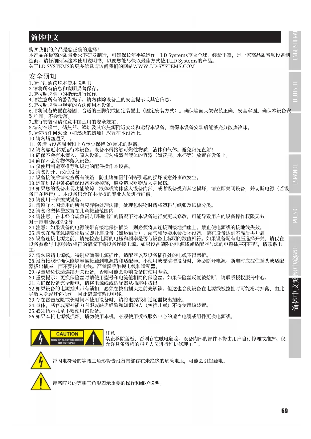 购买我们的产品是您正确的选择! 本产品在极高的质量要求下研发制造,可确保长年平稳运作。LDSystems享誉全球、经验丰富,是一家高品质音频设备制 造商。请仔细阅读这本使用说明书,以便您能尽快以最佳方式使用LDSystems的产品。