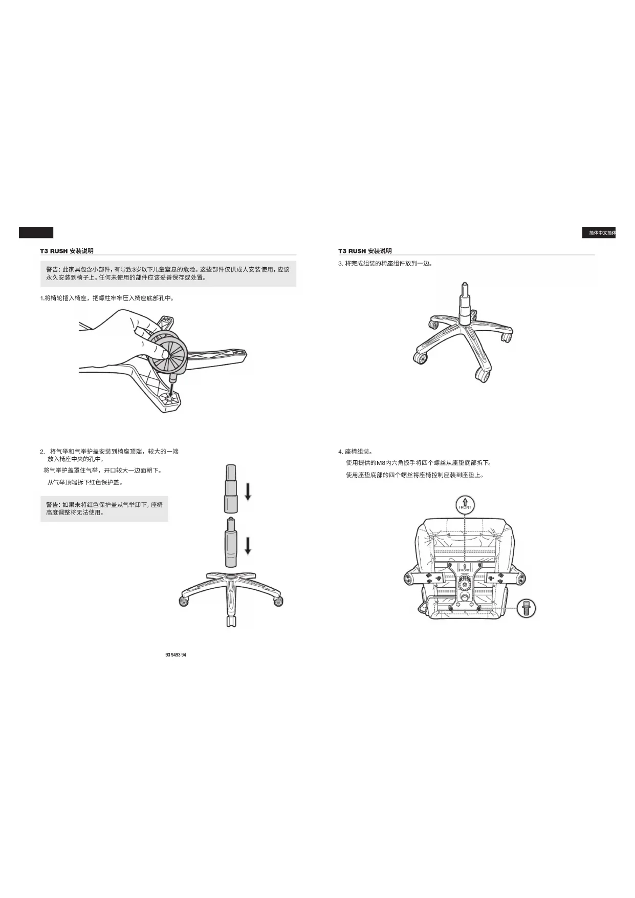 警 告: 本傢俱中的小型零件會對未滿 3 歲的孩童造成窒息危險。 這些零件僅供成人組裝 使用, 應永久固定在傢俱上。 任何未使用的零件應以適當方式存放或丟棄。 警 告: 如 果 未 將 紅 色 保 護 蓋 從 氣 舉 卸 下, 座 椅高度 調 整 將 無 法 作用。 組裝 T3 RUSH