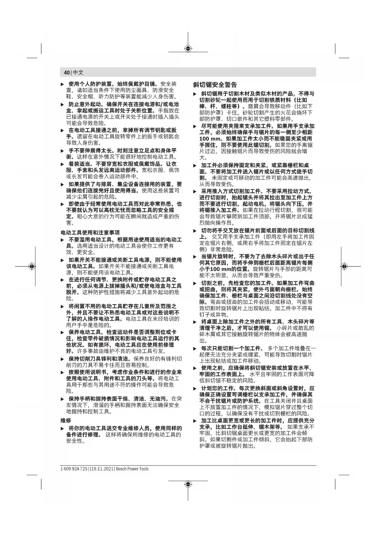 u 每次只能切割一个加工件。 多个加工件堆叠在一 起便无法充分夹紧或绷紧,可能导致切割时锯片 上出现粘结或加工件移动。 u 使用之前,应确保将斜切锯安装或放置在水平、 牢固的工作表面上。 水平且牢固的工作表面可降 低斜切锯不稳定的风险。 u 计划您的工作。每次更换斜面或斜角设置时,应 确保正确设置可调栅栏以支承加工件,并确保其 不会干扰锯片或防护系统。在工具关闭并且桌面 上不放置加工件的情况下,模拟锯片穿过整个切 口的过程,以确保没有干扰或切到栅栏的风险。 u 加工比桌面更宽或更长的加工件时,应提供充分 支承,比如工作台延伸、锯木架等。 如果支承不 牢固,比斜切锯桌面更长或更宽的加工件会倾 斜。如果切割件或加工件倾斜,它会抬起下部防 护罩或被旋转锯片抛出。 1 609 92A 72S | (19.11.2021) Bosch Power Tools中文 | 41 u 不要让另一个人代替工作台延伸或作为附加支 承。 如果加工件支承不稳定,会导致锯片出现粘 结或者加工件在切割操作期间移动,从而将您及