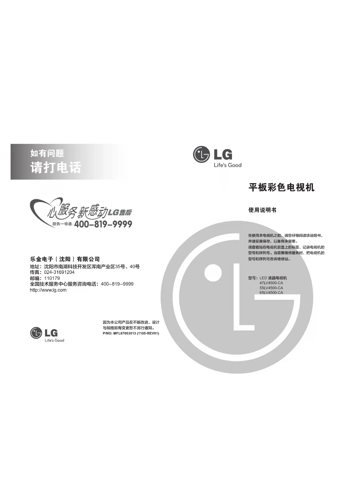 在使用本电视机之前,请您仔细阅读该说明书,并请妥善保存,以备将来需要。请查看贴在电视机后盖上的标签,记录电视机的型号和序列号。当需要维修服务时,把电视机的型号和序列号告诉维修站。型号:LED 液晶电视机 47LV 4500-CA 55LV 4500-CA 65LV 4500-CA目录