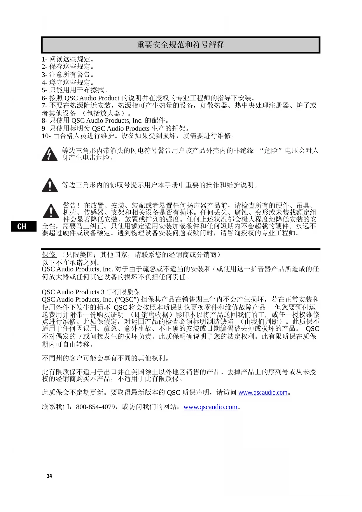 不同州的客户可能会享有不同的其他权利。 此有限质保不适用于出口并在美国领土以外地区销售的产品。去掉产品上的序列号或从未授 权的经销商购买本产品,不适用于此有限质保。 此质保会不定期更新。要取得最新版本的 QSC 质保声明,请访问 www.qscaudio.com。 联系我们:800-854-4079,或访问我们的网站:www.qscaudio.com 。CH