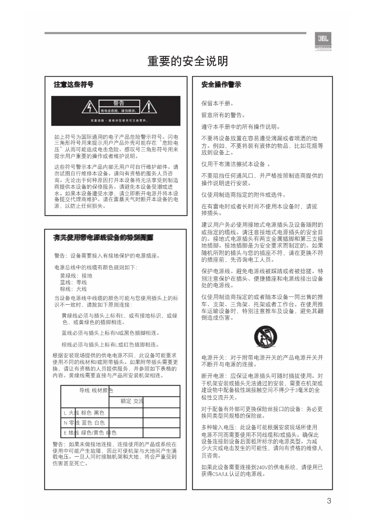 JBL Commercial Series2 本手册未提供有关产品设计、生产和变更的所有详细信息,也未列举出在安装、运行或维护本产品 时可能出现的所有情况。本手册里提供的信息在出版时为准确无误。然而,我们仍可能在出版本手