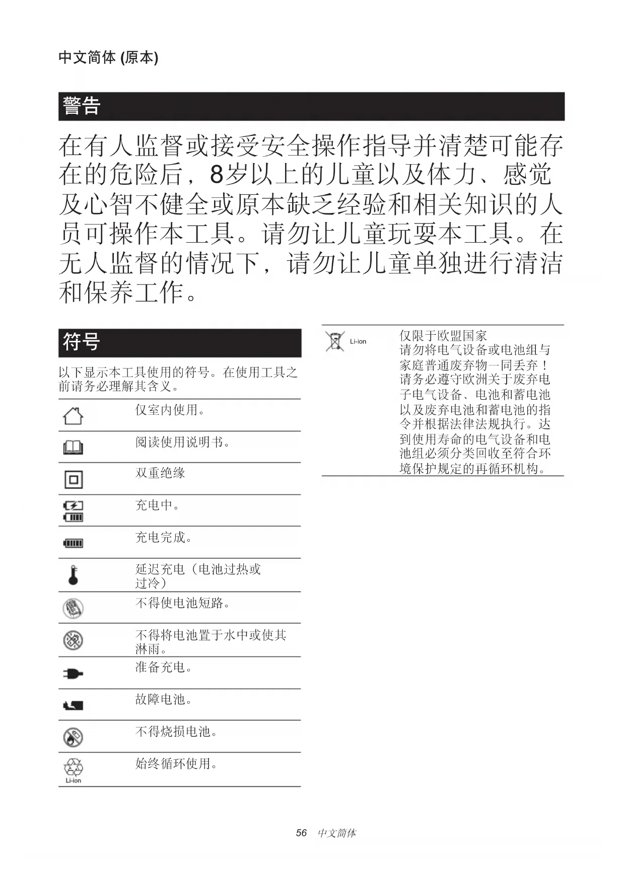 在有人监督或接受安全操作指导并清楚可能存 在的危险后,8岁以上的儿童以及体力、感觉 及心智不健全或原本缺乏经验和相关知识的人 员可操作本工具。请勿让儿童玩耍本工具。在 无人监督的情况下,请勿让儿童单独进行清洁