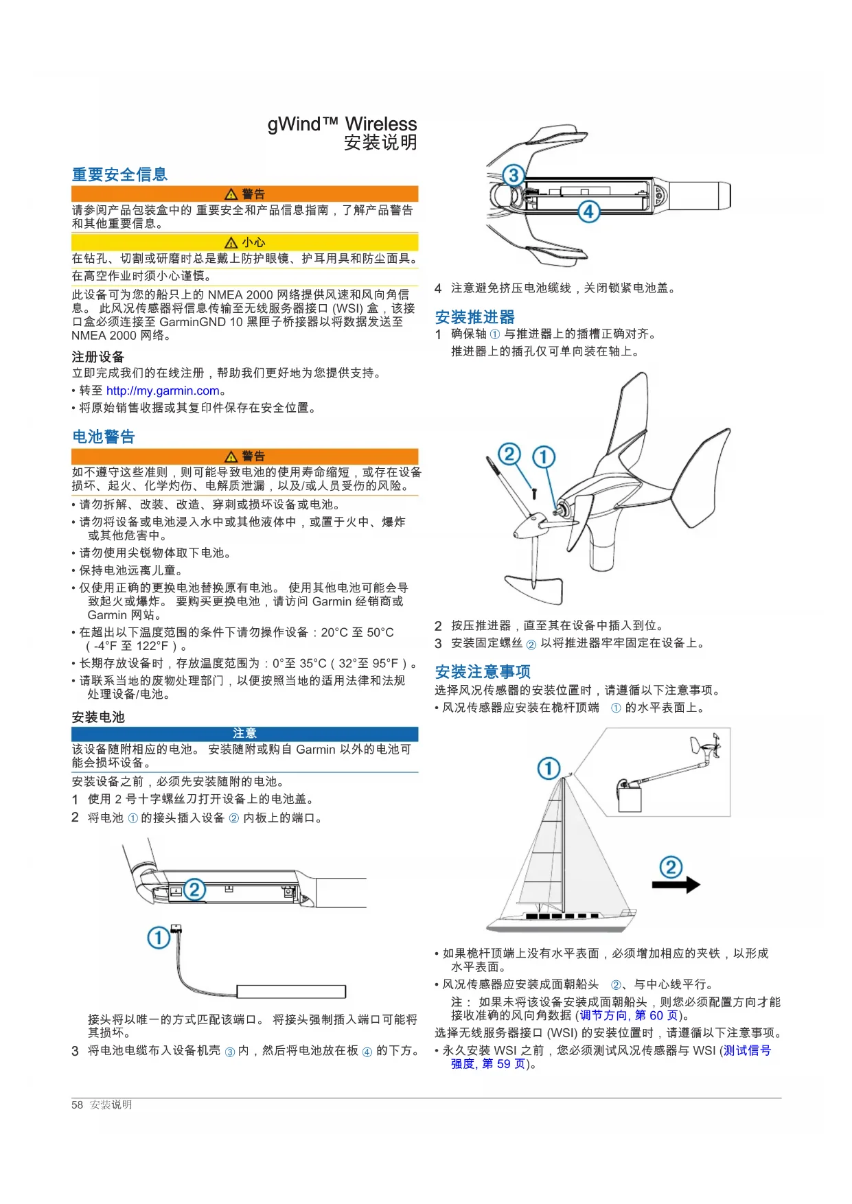 在钻孔、切割或研磨时总是戴上防护眼镜、护耳用具和防尘面具。 在高空作业时须小心谨慎。 此设备可为您的船只上的 NMEA 2000 网络提供风速和风向角信 息。 此风况传感器将信息传输至无线服务器接口 (WSI) 盒,该接 口盒必须连接至 GarminGND 10 黑匣子桥接器以将数据发送至 NMEA 2000 网络。