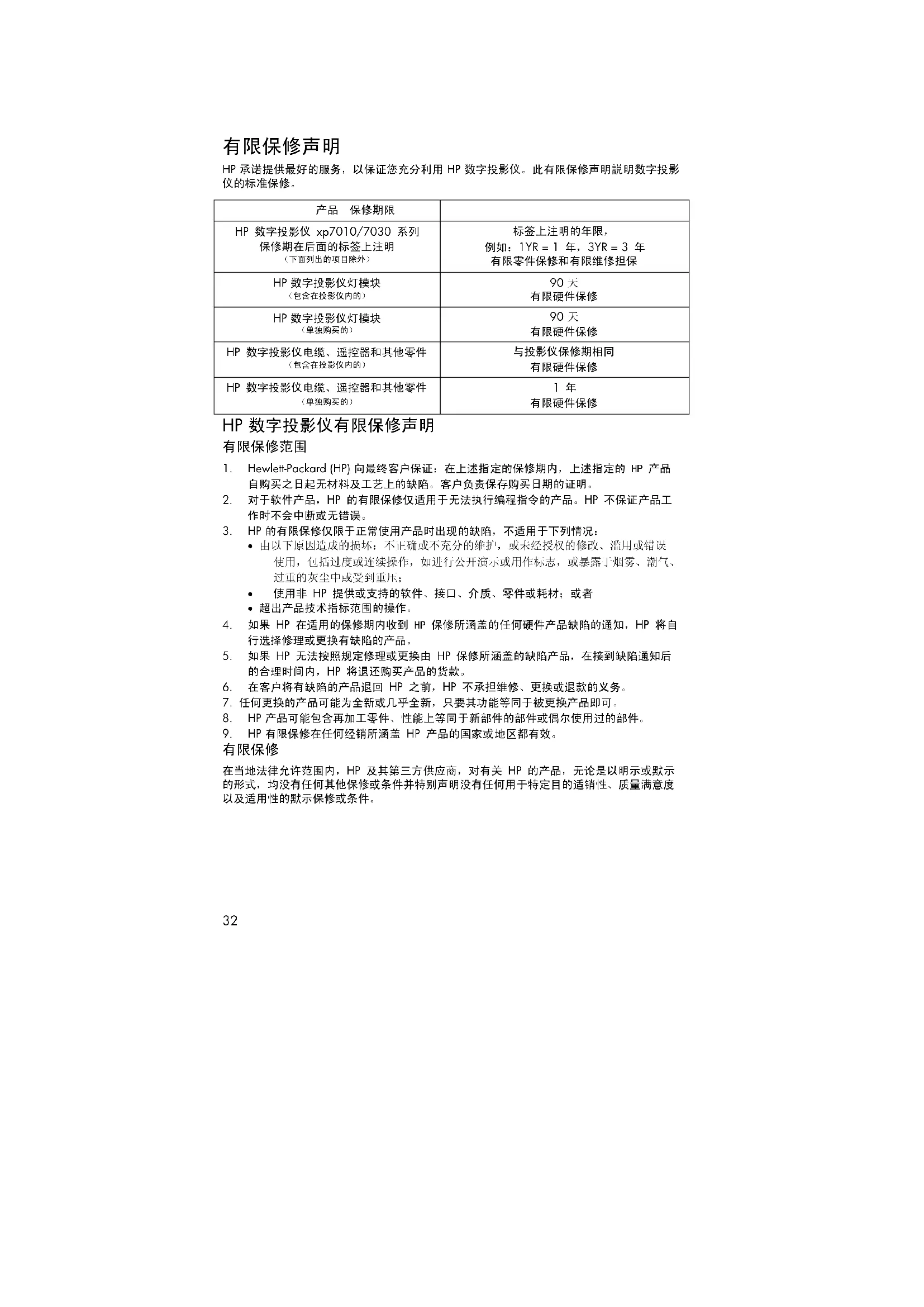 HP 承诺提供最好的服务,以保证您充分利用 HP 数字投影仪。此有限保修声明説明数字投影