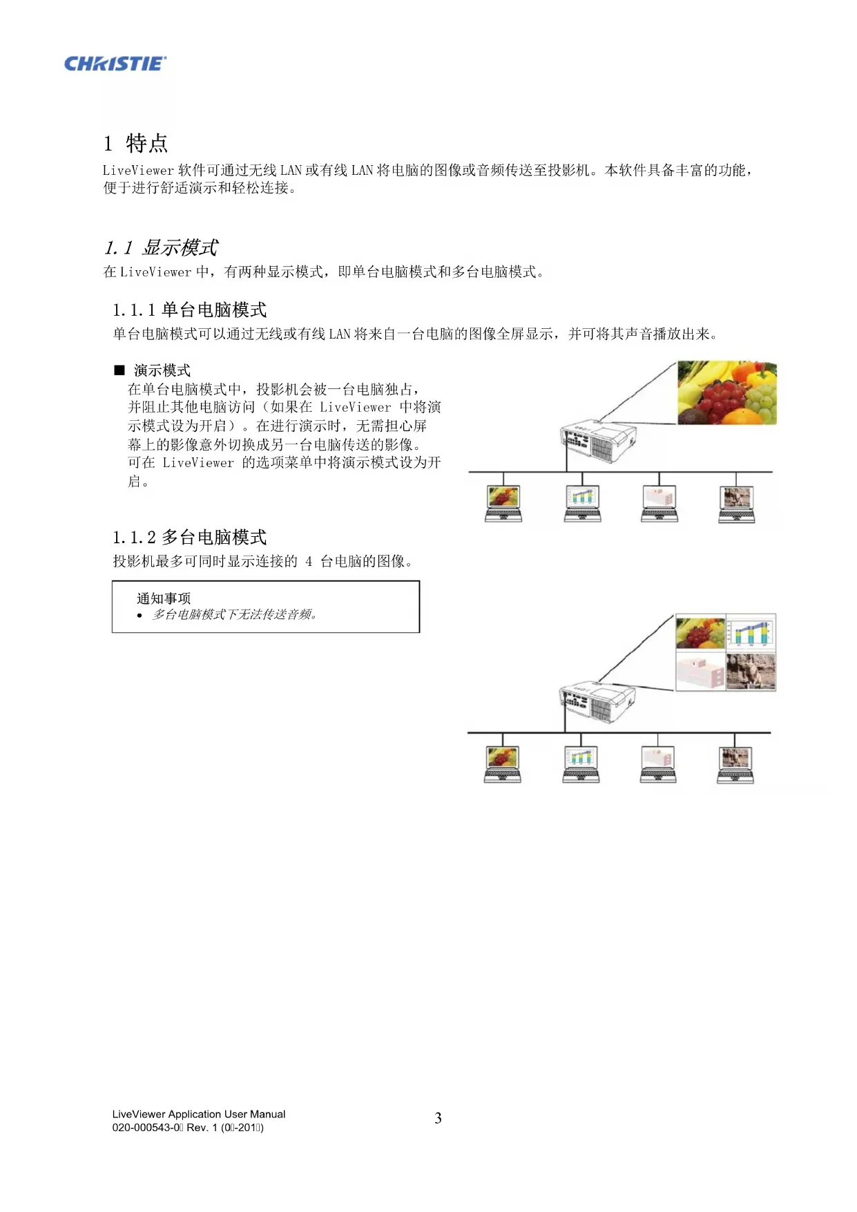 版本中的“x”表示 0 或更大数字。 仅限于 Windows® 32 位版本。 LiveViewer Application User Manual 020-000543-0 Rev. 1 (0-201)6 关于电脑的通知事项 如果电脑的操作系统版本或网络适配器的驱动程序不正确,可能无法正确传输图像。强烈建议您检查操作系统和驱动程序更新。 根据无线网络设备的类型和所使用电脑的情况,投影机可能无法与电脑进行无线连接,即使使用的电脑内置无线 LAN 功能。如果出现问题,请使用 Wi-Fi 认证的无线网络设备。 如果在 Windows Vista®或 Windows® 7 系统上使用 LiveViewer,在投影机上显示电脑图像时无法使用 Aero®透明效果。 在 Windows Vista®,Windows® 7 或 Windows® 8 上安装 LiveViewer 时,会显示 UAC(用户账户控制)讯息。 您的电脑必须满足操作系统的最低硬件要求。 LiveViewer 无法在未被更新至 Sevice Pack 1 或更新版本的 Windows Vista®下运行。请为 Windows Vista®安装 最新的 Sevice Pack。 根据电脑硬件和软件的组合,可能不支持通过网络进行的视频传输。在这种情形下,请使用视频/电脑电缆。