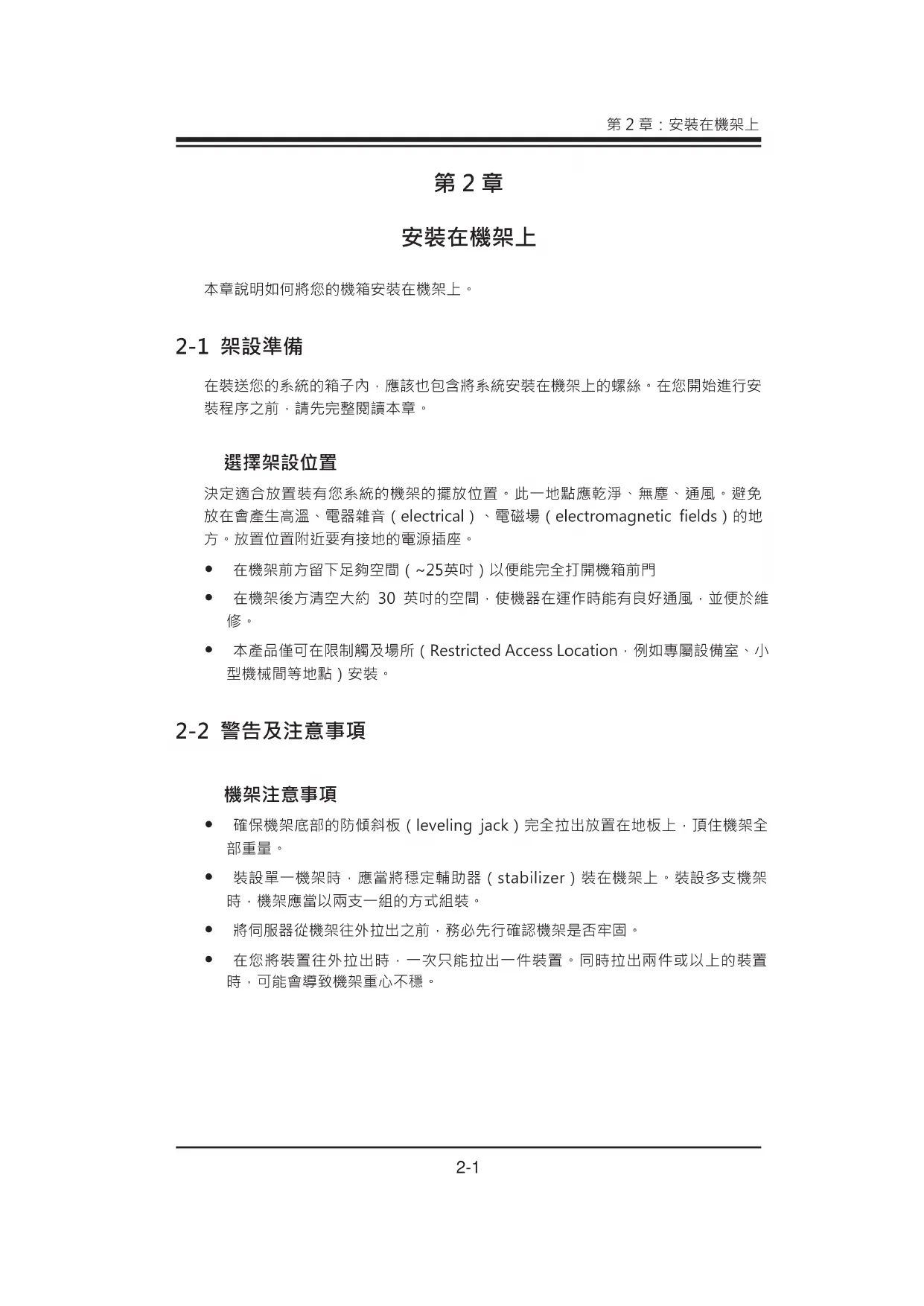 環境操作溫度(Ambient Operating Temperature) 若安裝在密閉式或多組機架中,機架環境的環境操作溫度(ambient operating temperature)可能會大過室內操作溫度。因此,應考慮將設備安裝在溫度能與製造 商所規定最大的額定環境溫度(Tmra)相符的地方。 減少送風(Reduced Airflow) 設備應當安裝在機架上,才不會使安全操作所需的送風量受到影響而減弱。 機械負載(Mechanical Loading) 設備應當安裝在機架上,才不會因機械負載而受損。 電流過載(Circuit Overloading) 應考量設備與電源接線,任何可能出現的電流過載對於過電保護(overcurrent protection)及電源線配置的影響。在評估考量這項安裝前,應當使用設備名稱評比 (equipment nameplate rating)。 安全接地(Reliable Ground) 必須隨時保持安全接地(reliable ground)。為了確保安全接地程序,機架本身應 當接地。也應特別留意除了其他直接連到分支電路(branch circuit)(例如使用延 長線)之外的電源接線。第 2 章:安裝在機架上 2-3 警告!為了避免在將系統裝入機架或維修時造成身體損傷,務必特別小心 確認系統保持穩定。以下說明指示用以確保您的安全:
