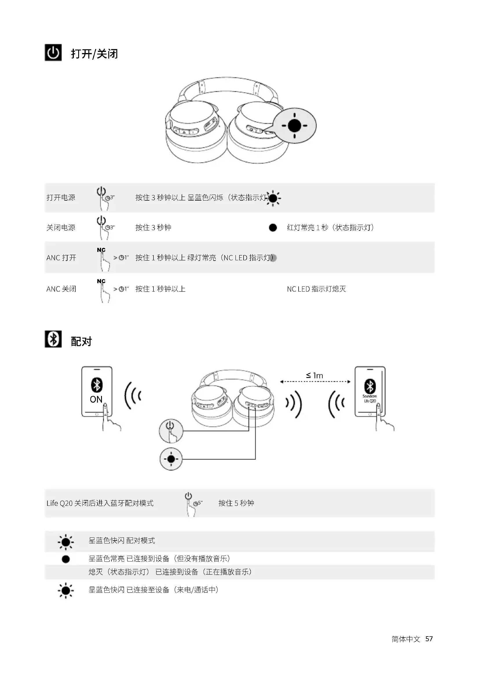 ≤ 1m Soundcore Life Q20 Life Q20 关闭后进入蓝牙配对模式