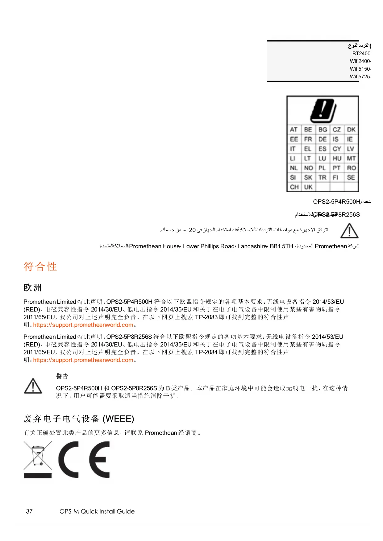 OPS2-5P4R500H 和 OPS2-5P8R256S 为 B 类产品。本产品在家庭环境中可能会造成无线电干扰,在这种情 况下,用户可能需要采取适当措施消除干扰。 废 弃 电 子 电气 设 备 (WEEE) 有关正确处置此类产品的更多信息,请联系 Promethean 经销商。 37 OPS-M Quick Install GuideOPS2-5P4R500H 和 OPS2-5P8R256S 配 有 Wi-Fi 模 块