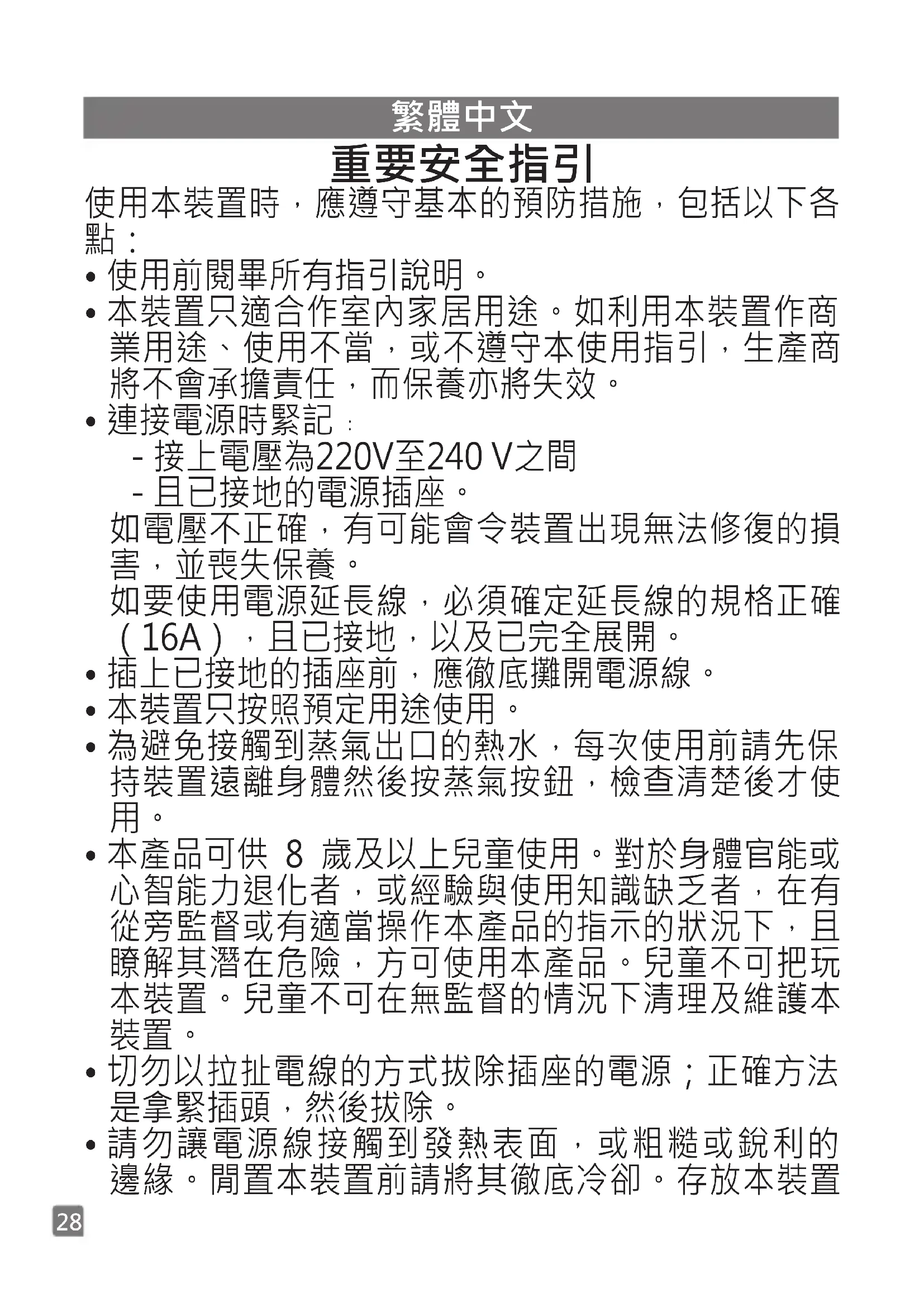 - 肢體、感官或心智能力較弱,或者經驗或知識不足 的人士(包括兒童),均不適宜使用本裝置,除非 有人負責其安全並從旁監督,或已事先向其提供裝 置的使用指示。應在旁監督兒童,確保他們不會把