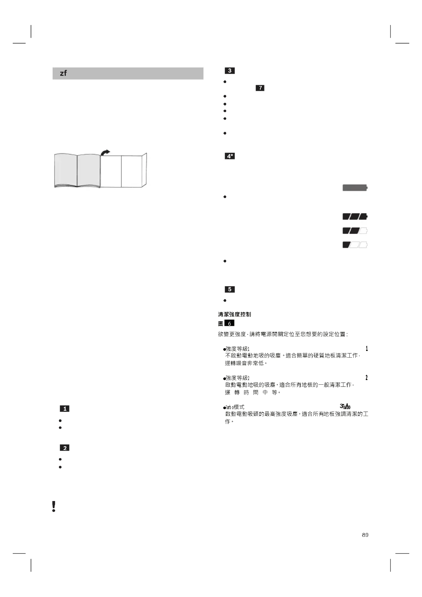 只可使用隨貨附送的充電線進行充電。 僅可依照銘牌資料連接充電線和使用。 本產品僅可存放於室內並充電。 不可使本產品曝露在溫度 0°C 以下和 40°C 以上。 未安裝集塵袋或集塵盒、馬達防護和排氣過濾網時,絕不 可進行吸塵。>= 可能會造成產品損壞! 吸塵時,避免將吸頭和吸氣管置於頭部附近。=> 此舉可能造成受傷危險! 電線如損壞則不得再使用,並應更換新的原廠充電線。 不可拉住充電線將產品拔掉電源,而應拉住插頭。 不可將電線拉往鋒利的邊緣並且不可擠壓。 在吸塵器上進行任何操作之前,請先關機或拔掉充電線和 不可操作損壞的吸塵器。 出現故障時,請關機或拔掉充電線和電源。 為避免發生危險,僅可由授權的客服中心進行吸塵器的維修和備件更換。 發生以下狀況時,請立即關機停用並連絡客服中心: − 如不慎吸入液體,或液體滲入產品內部時 − 如產品掉落並受損時。 請保護吸塵器不受氣候、濕度和熱源的影響。 不可將可燃性或含酒精的物品放置在濾網(濾袋、馬達防護濾網、排氣濾網等)上。 本吸塵器不適用於建築場所。=> 吸入建築碎片可能造成本產品損壞。 不需吸塵時,請將產品關機。 包裝可保護吸塵器在運送時不受損傷。因此我們建議將保留包裝,以備運輸之用。33