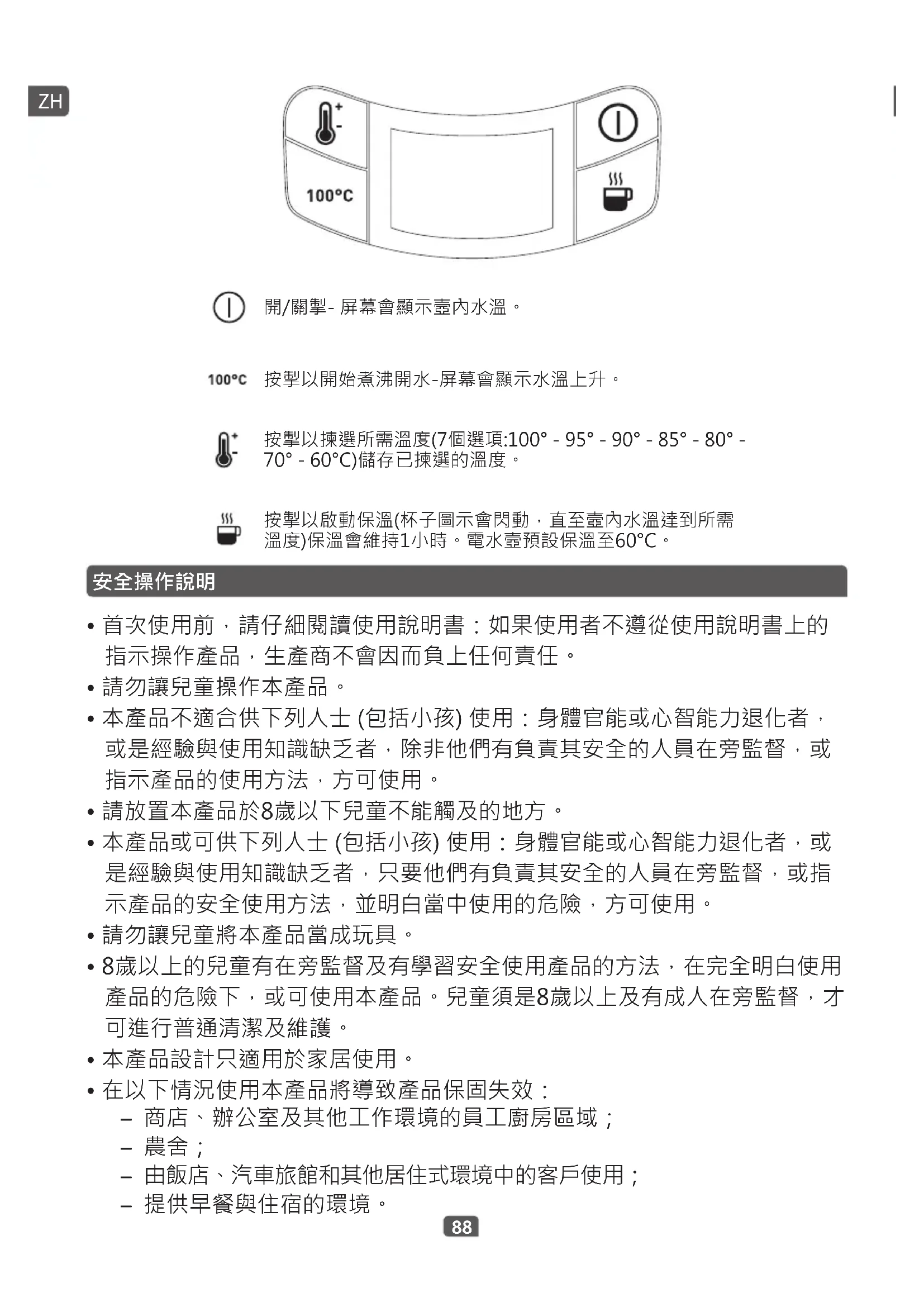 開/關掣-屏幕會顯示壼內水溫。 按掣以開始煮沸開水-屏幕會顯示水溫上升。 按掣以揀選所需溫度(7個選項:100°-95°-90°-85°-80°- 70°-60°C)儲存已揀選的溫度。 按掣以啟動保溫(杯子圖示會閃動,直至壼內水溫達到所需 溫度)保溫會維持1小時。電水壼預設保溫至60°C。89