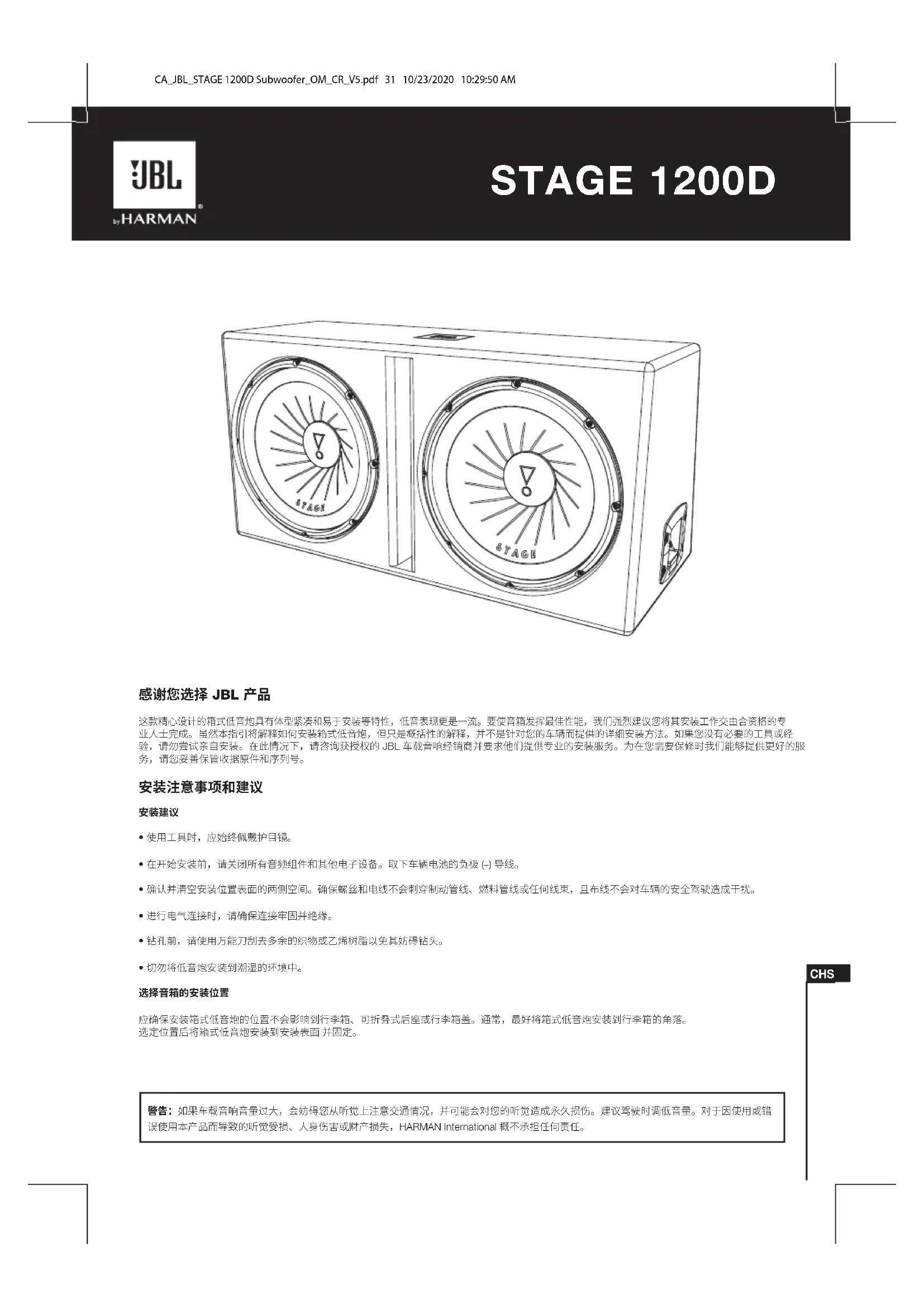 500Wrms 1000W 94dB 34Hz – 200Hz 2 ohms 30-1/8" x 15" x 13-11/16" x 10-1/2"/ (764.5mm x 380mm x 347.5mm x 266.7mm) Stage 1200D STAGE 1200D CA_JBL_STAGE 1200D Subwoofer_OM_CR_V5.pdf 30 10/23/2020 10:29:50 AM警告:如果车载音响音量过大,会妨碍您从听觉上注意交通情况,并可能会对您的听觉造成永久损伤。建议驾驶时调低音量。对于因使用或错 误使用本产品而导致的听觉受损、人身伤害或财产损失,HARMAN International 概不承担任何责任。 感谢您选择 JBL 产品 这款精心设计的箱式低音炮具有体型紧凑和易于安装等特性,低音表现更是一流。要使音箱发挥最佳性能,我们强烈建议您将其安装工作交由合资格的专 业人士完成。虽然本指引将解释如何安装箱式低音炮,但只是概括性的解释,并不是针对您的车辆而提供的详细安装方法。如果您没有必要的工具或经