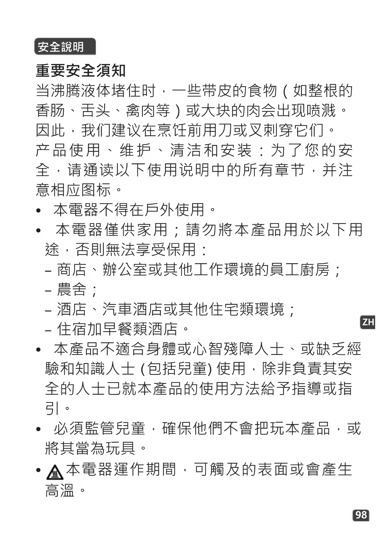 - 為保障您的安全,本電器符合現行標準及規章條例 (低壓指令、電磁 相容性、食品合規物料、環保指令等…)。