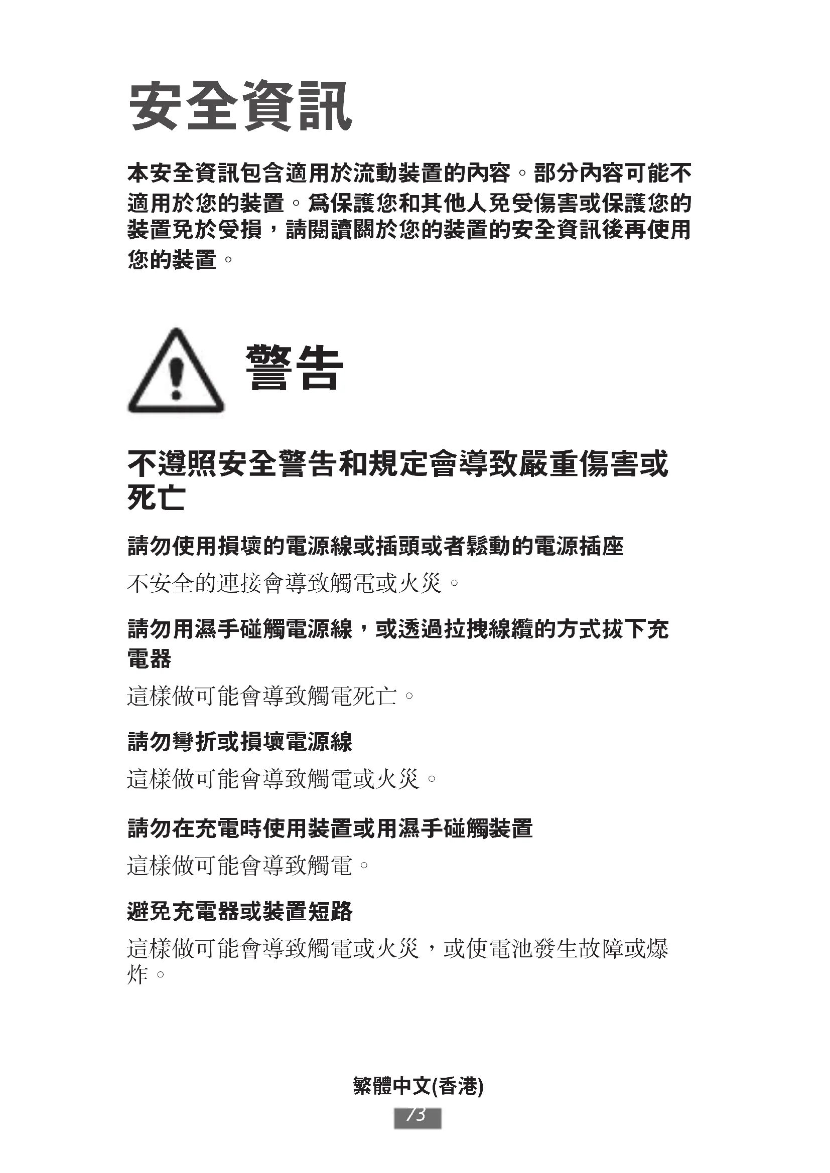 請勿咬或吮吸裝置或電池 這樣做可能會損壞裝置或導致爆炸或火災。 兒童或動物會因吞嚥小部件而窒息。 如果兒童使用裝置,請確保他們正確地使用裝置。 請勿將裝置或隨附的配件戳向眼睛、耳朵或嘴巴 這樣做可能會引起窒息或重傷。 請勿使用已損壞或洩漏的鋰離子電池 為了安全處置鋰離子電池,請聯絡最近的授權服務中心。繁體中文(香港)