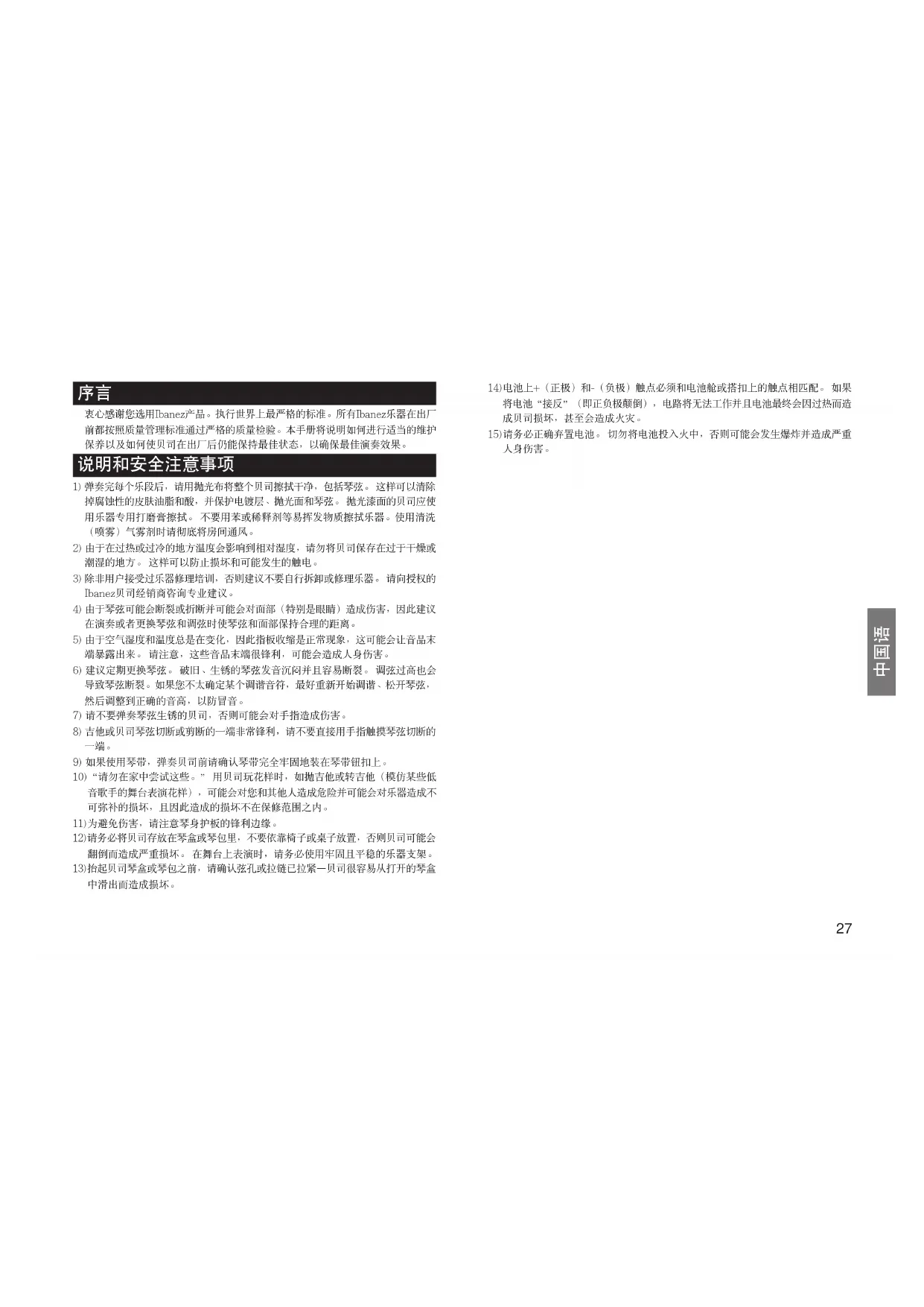 衷心感谢您选用Ibanez产品。执行世界上最严格的标准。所有Ibanez乐器在出厂 前都按照质量管理标准通过严格的质量检验。本手册将说明如何进行适当的维护 保养以及如何使贝司在出厂后仍能保持最佳状态,以确保最佳演奏效果。
