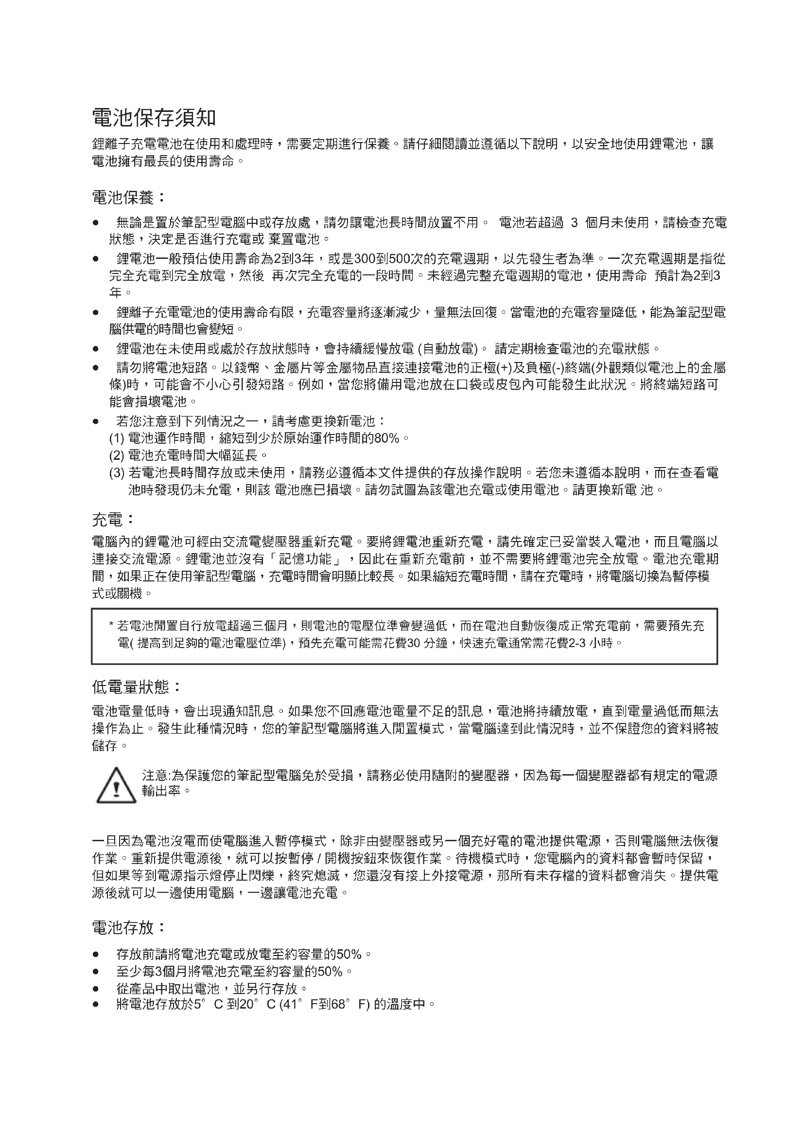 - 若電池閒置自行放電超過三個月,則電池的電壓位準會變過低,而在電池自動恢復成正常充電前,需要預先充 電( 提高到足夠的電池電壓位準),預先充電可能需花費30 分鐘,快速充電通常需花費2-3 小時。