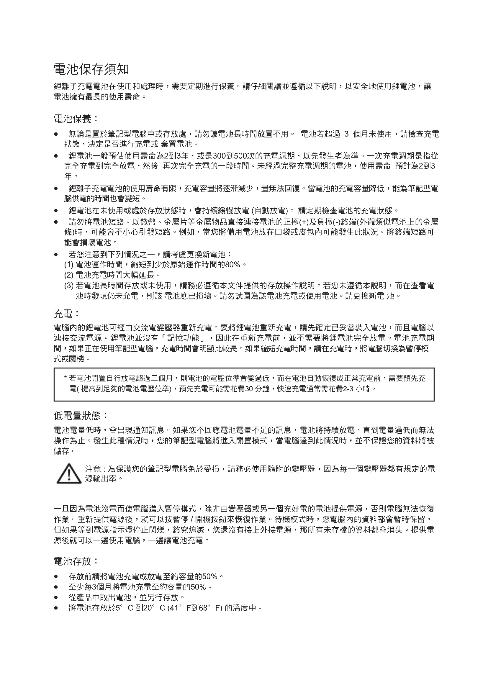 - 若電池閒置自行放電超過三個月,則電池的電壓位準會變過低,而在電池自動恢復成正常充電前,需要預先充 電( 提高到足夠的電池電壓位準),預先充電可能需花費30 分鐘,快速充電通常需花費2-3 小時。
