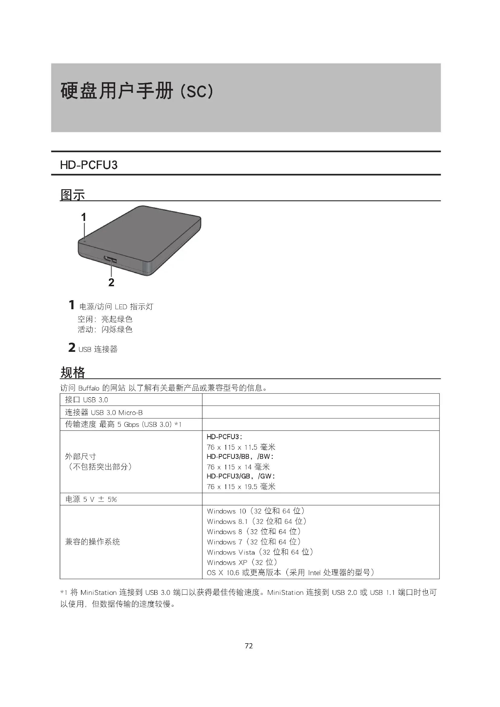 Windows 10(32 位和 64 位) Windows 8.1(32 位和 64 位) Windows 8(32 位和 64 位) Windows 7(32 位和 64 位) Windows Vista(32 位和 64 位) Windows XP(32 位) OS X 10.5 或更高版本(采用 Intel 处理器的型号) *1 将 MiniStation 连接到 USB 3.0 端口以获得最佳传输速度。MiniStation 连接到 USB 2.0 或 USB 1.1 端口时也可 以使用,但数据传输的速度较慢。 HD-PCTU3,HD-PCU3