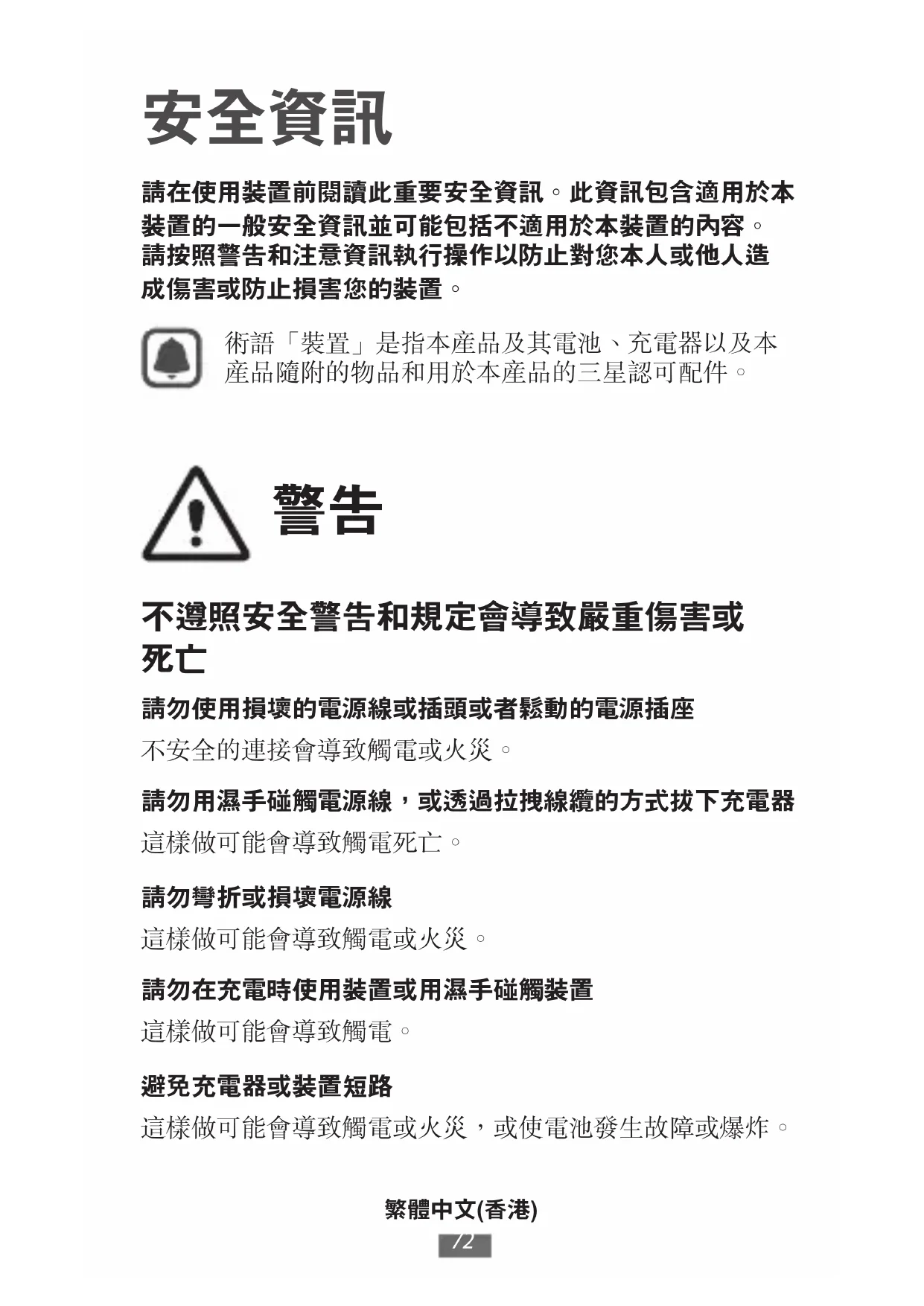 請在使用裝置前閱讀此重要安全資訊。此資訊包含適用於本 裝置的一般安全資訊並可能包括不適用於本裝置的內容。 請按照警告和注意資訊執行操作以防止對您本人或他人造 成傷害或防止損害您的裝置。 術語「裝置」是指本產品及其電池、充電器以及本 產品隨附的物品和用於本產品的三星認可配件。