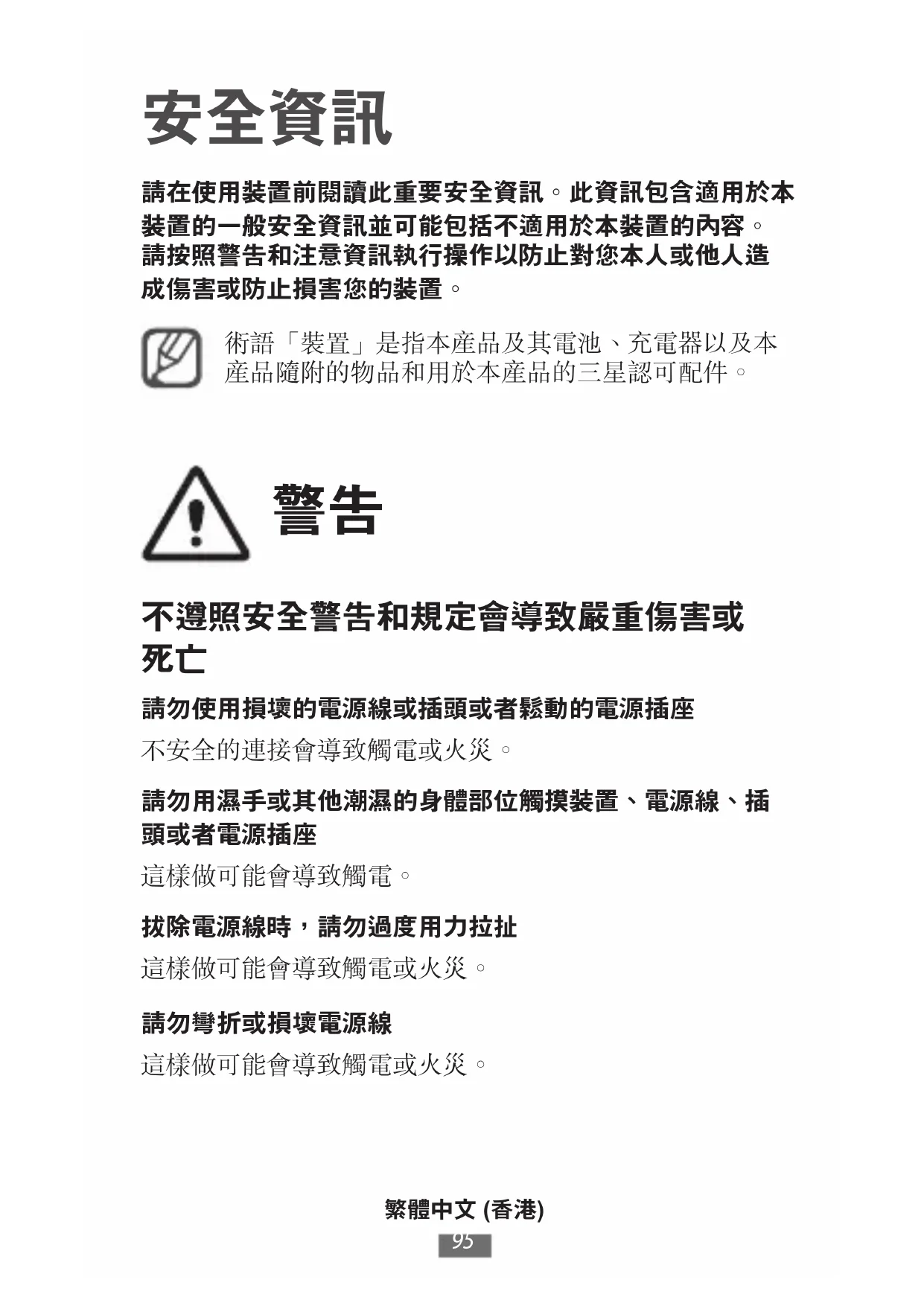 請在使用裝置前閱讀此重要安全資訊。此資訊包含適用於本 裝置的一般安全資訊並可能包括不適用於本裝置的內容。 請按照警告和注意資訊執行操作以防止對您本人或他人造 成傷害或防止損害您的裝置。 術語「裝置」是指本產品及其電池、充電器以 及本產品的隨附項目和用於本產品的三星核可
