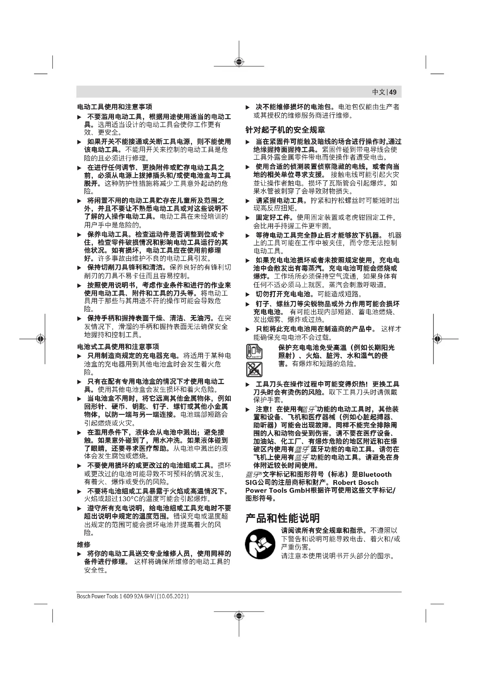 1 609 92A 6HV | (10.05.2021) Bosch Power Tools中文 | 49 电动工具使用和注意事项 u 不要滥用电动工具,根据用途使用适当的电动工 具。选用适当设计的电动工具会使你工作更有