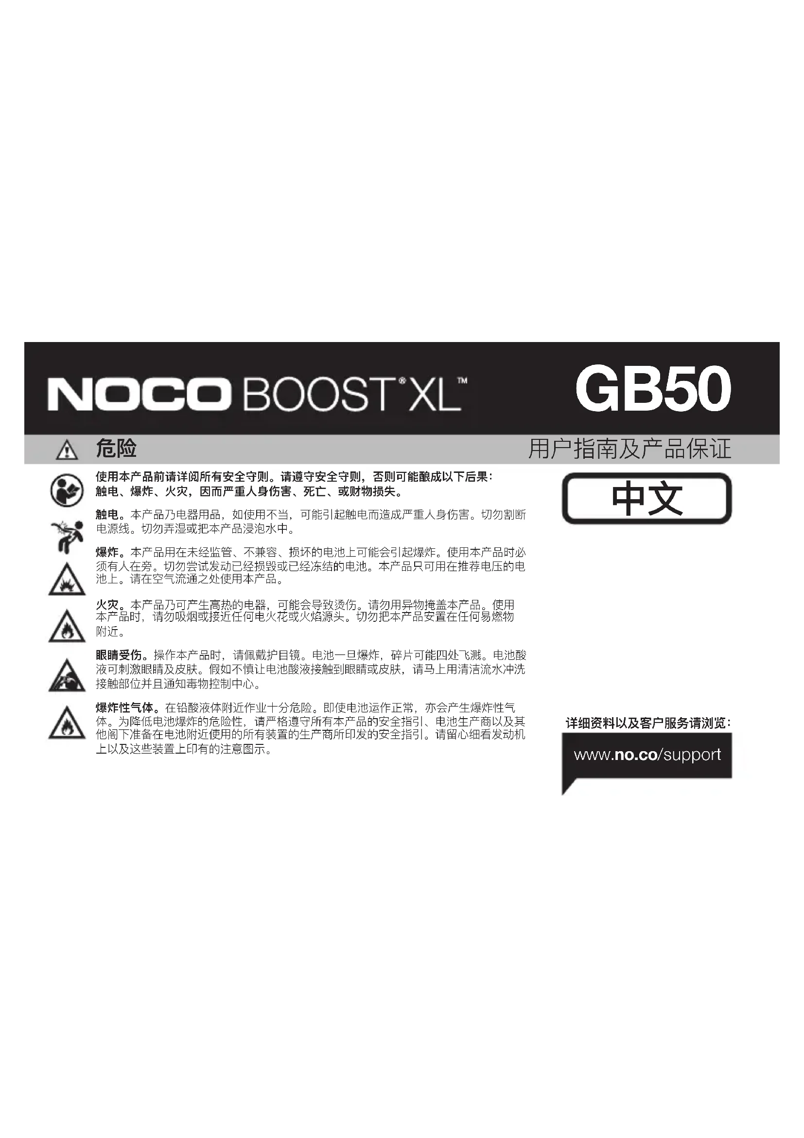 www.no.co/supportCN 个人使用注意事项。本产品只能在拟定用途上使用。为预防紧急情况,请在他人能听见使用者呼救或在能马上营救使用者的邻近地点使用 本产品。预防电池酸液溅伤,请在作业现场预先准备清洁水源及肥皂。在电池附近作业时请佩戴完备的护目镜及防护服。处理电池及有关 物质后必须洗净双手。进行有关电池的工作时切勿处理或佩戴包括工具、手表、饰物在内的任何金属物件。万一金属物件跌落电池上,可 能会激发火花或引起短路,导致能造成人身伤害、死亡或财物损失的触电、火灾、爆炸。未成年使用者。如“购买者”打算让未成年人使用 本产品,购买本产品的成年人必须同意在让任何未成年人使用本产品之前,向该当未成年人提供详细指引及警告。如“购买者”未能遵守此 一条款,“购买者”必须负上全责,并且同意如该当未成年使用者误用或滥用本产品,将保障NOCO不会因而蒙受损失。 窒息危险。本产品 配件有潜在儿童窒息危险。切勿在没有成年人监管的情况下让儿童接触本产品及任何配件。本产品并非玩具。处理。 请小心处理本产品。 碰撞可能损毁本产品。切勿使用包括外壳有裂痕或电线损毁等损毁的产品。切勿把有损毁的电源线与本产品一起使用。潮湿和液体可能会 损毁本产品。切勿在任何液体附近处理本产品或任何电气部件。请在干燥环境下操作及储存本产品。如本产品被沾湿,切勿操作本产品。 如本产品在操作中被沾湿,请马上切断与汽车电池的连接及停止使用。切断连接时切勿拉扯电线。 改装。 切勿尝试更改、改装或修理本 产品任何部分。分解本产品可以导致人身伤害、死亡或财物损失。如本产品已经损毁、发生故障、或接触过任何液体,请停止使用并通知