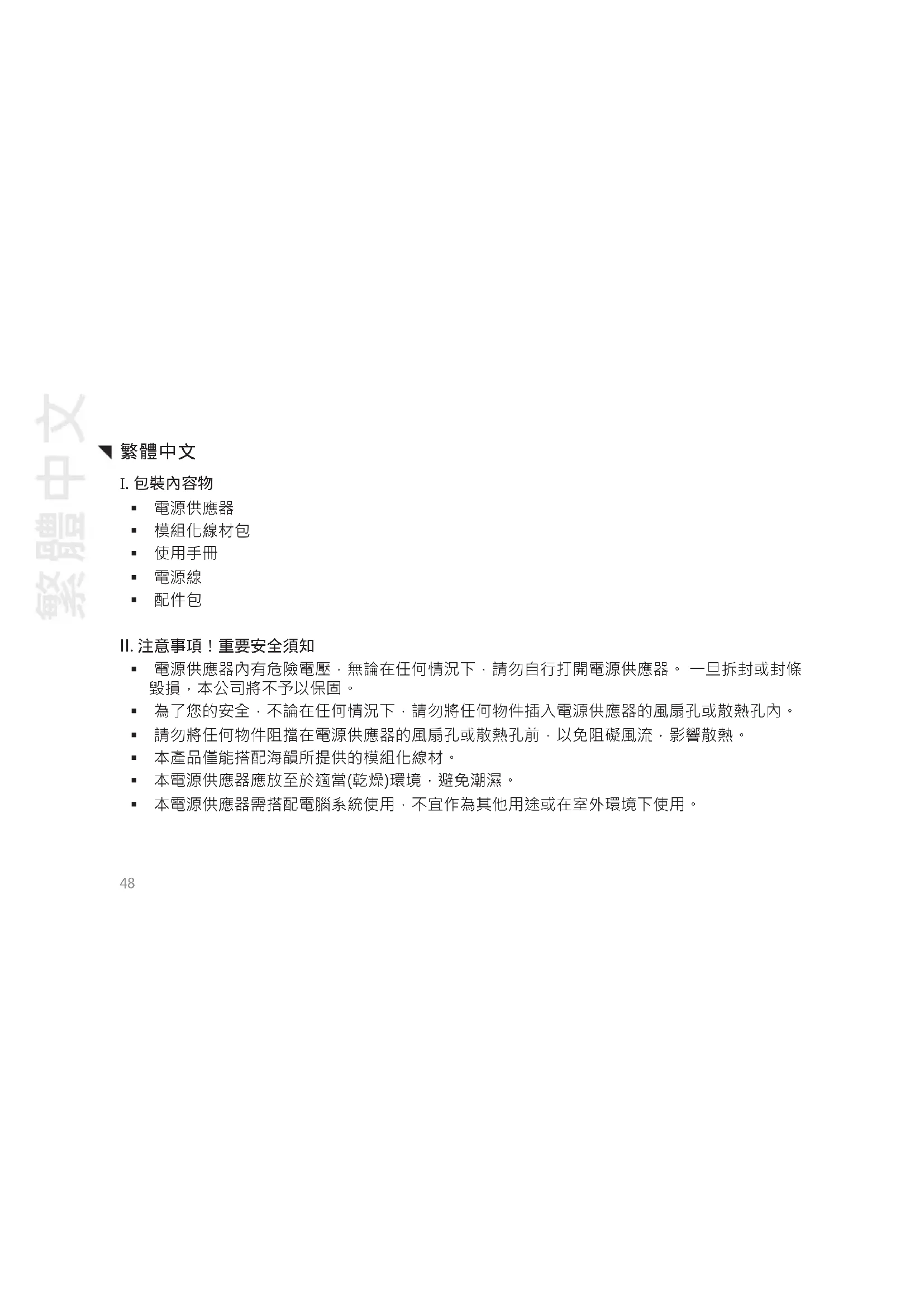 電源供應器內有危險電壓,無論在任何情況下,請勿自行打開電源供應器。 一旦拆封或封條 毀損,本公司將不予以保固。 為了您的安全,不論在任何情況下,請勿將任何物件插入電源供應器的風扇孔或散熱孔內。 請勿將任何物件阻擋在電源供應器的風扇孔或散熱孔前,以免阻礙風流,影響散熱。 本產品僅能搭配海韻所提供的模組化線材。 本電源供應器應放至於適當(乾燥)環境,避免潮濕。 本電源供應器需搭配電腦系統使用,不宜作為其他用途或在室外環境下使用。 繁體中文49