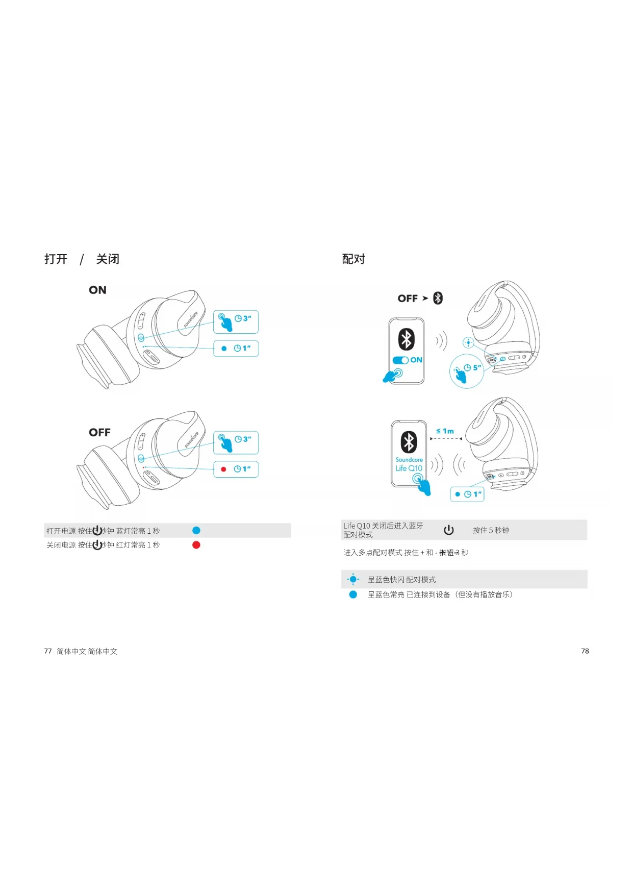打开电源 按住 3 秒钟 蓝灯常亮 1 秒 关闭电源 按住 3 秒钟 红灯常亮 1 秒