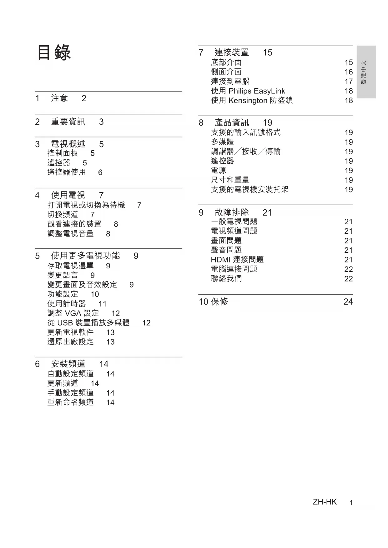 1 注意 2 2 重要資訊 3 3 電視概述 5 控制面板 5 遙控器 5 遙控器使用 6 4 使用電視 7 打開電視或切換為待機 7 切換頻道 7 觀看連接的裝置 8 調整電視音量 8 5 使用更多電視功能 9 存取電視選單 9 變更語言 9 變更畫面及音效設定 9 功能設定 10 使用計時器 11 調整VGA設定 12 從USB裝置播放多媒體 12 更新電視軟件 13 還原出廠設定 13 6 安裝頻道 14 自動設定頻道 14 更新頻道 14 手動設定頻道 14 重新命名頻道 14 7 連接裝置 15 底部介面 15 側面介面 16 連接到電腦 17 使用PhilipsEasyLink 18 使用Kensington防盜鎖 18 8 產品資訊 19 支援的輸入訊號格式 19 多媒體 19 調諧器/接收/傳輸 19 遙控器 19 電源 19 尺寸和重量 19 支援的電視機安裝托架 19 9 故障排除 21 一般電視問題 21 電視頻道問題 21 畫面問題 21 聲音問題 21 HDMI連接問題 21 電腦連接問題 22 聯絡我們 22 10保修 24ZH-HK