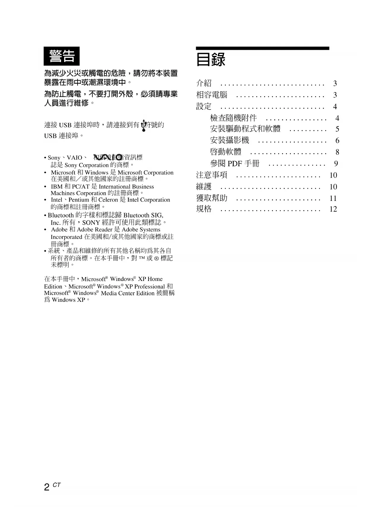 - 系統、產品和維修的所有其他名稱均為其各自所有者的商標。在本手冊中,對 ™ 或 ® 標記 在本手冊中,Microsoft Windows XP HomeEdition、Microsoft Windows XP Professional 和Microsoft Windows Media Center Edition 被簡稱為 Windows XP。 為減少火災或觸電的危險,請勿將本裝置暴露在雨中或潮濕環境中。為防止觸電,不要打開外殼,必須請專業人員進行維修。連接 USB 連接埠時,請連接到有 符號的USB 連接埠。