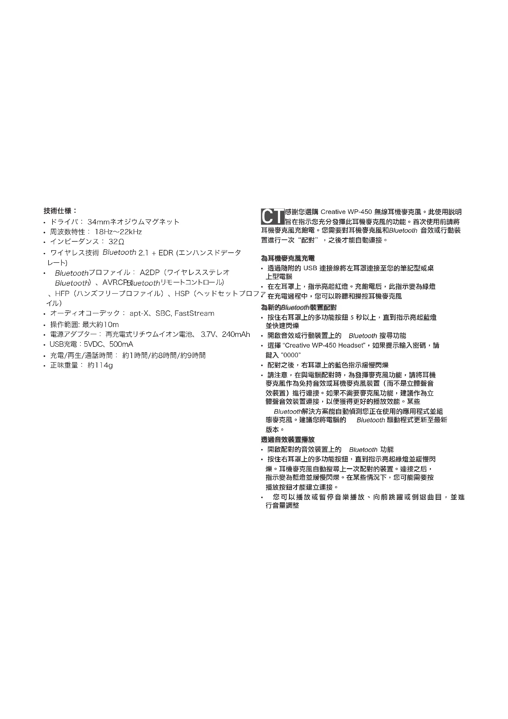 感謝您選購 Creative WP-450 無線耳機麥克風。此使用說明旨在指示您充分發揮此耳機麥克風的功能。首次使用前請將耳機麥克風充飽電。您需要對耳機麥克風和Bluetooth 音效或行動裝置進行一次“配對”,之後才能自動連接。