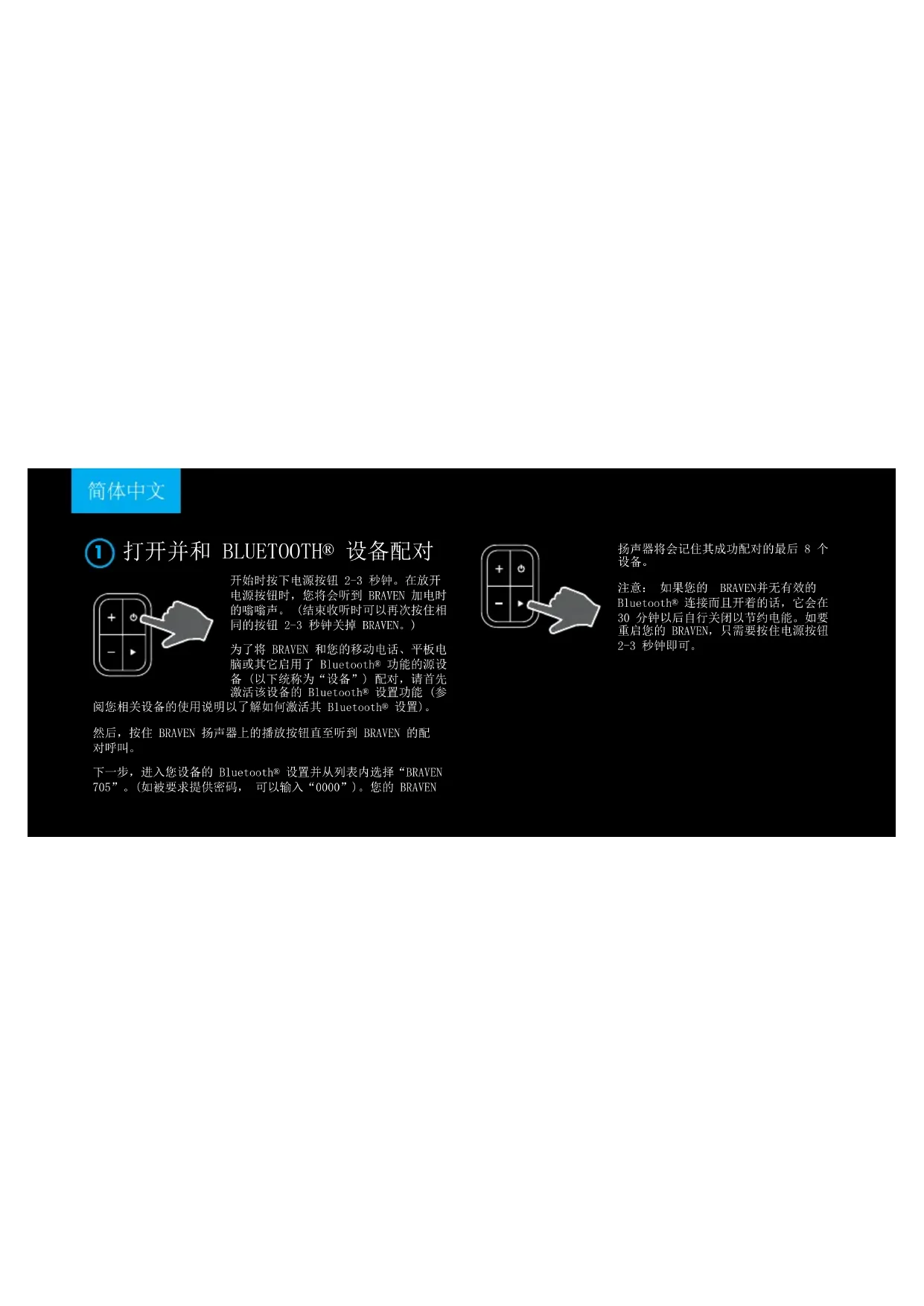 开始时按下电源按钮 2-3 秒钟。在放开 电源按钮时,您将会听到 BRAVEN 加电时 的嗡嗡声。 (结束收听时可以再次按住相 同的按钮 2-3 秒钟关掉 BRAVEN。) 为了将 BRAVEN 和您的移动电话、平板电 脑或其它启用了 Bluetooth® 功能的源设 备 (以下统称为“设备”) 配对,请首先 激活该设备的 Bluetooth® 设置功能 (参 阅您相关设备的使用说明以了解如何激活其 Bluetooth® 设置)。 然后,按住 BRAVEN 扬声器上的播放按钮直至听到 BRAVEN 的配