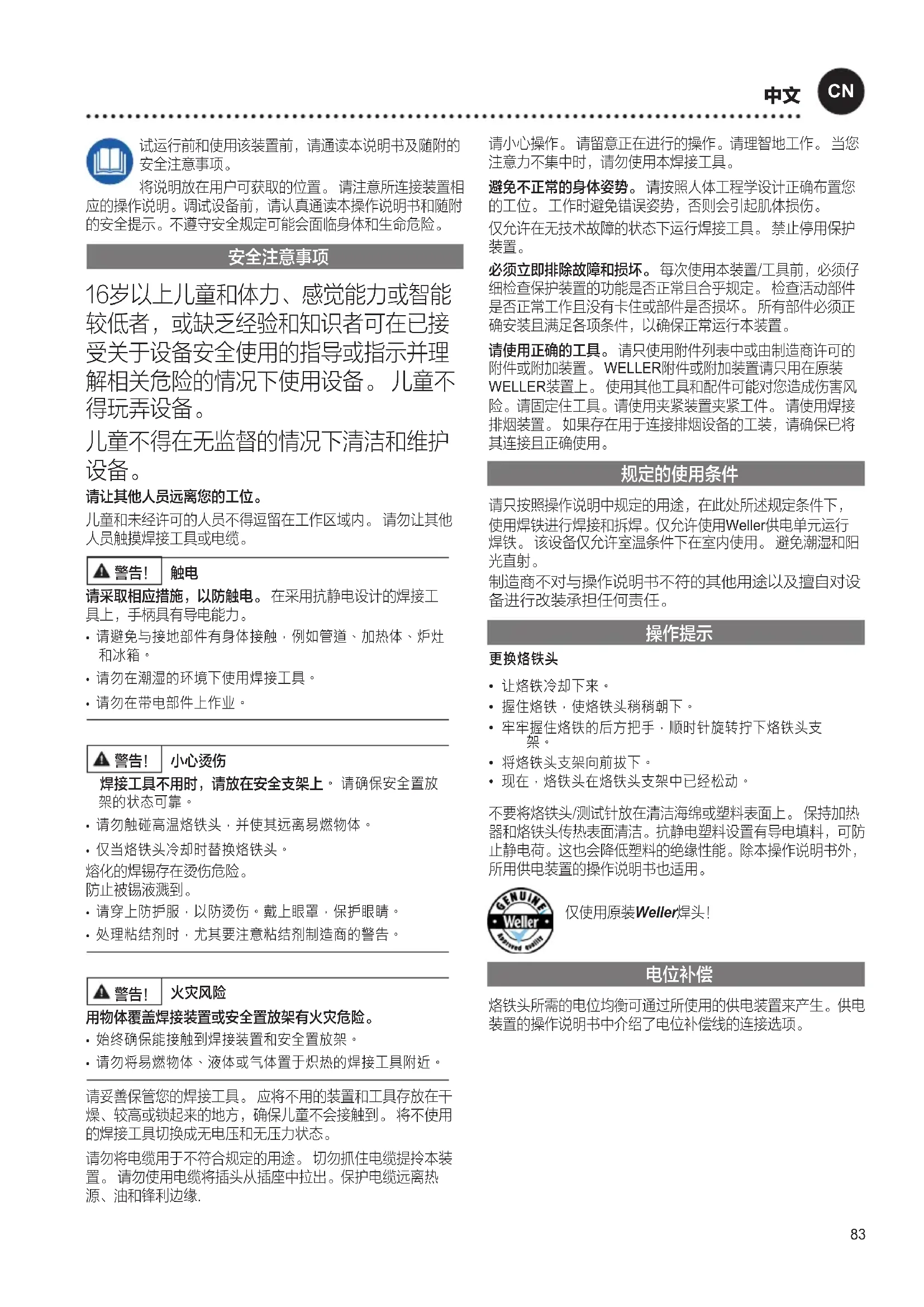 请只按照操作说明中规定的用途,在此处所述规定条件下, 使用焊铁进行焊接和拆焊。仅允许使用Weller供电单元运行 焊铁。 该设备仅允许室温条件下在室内使用。 避免潮湿和阳