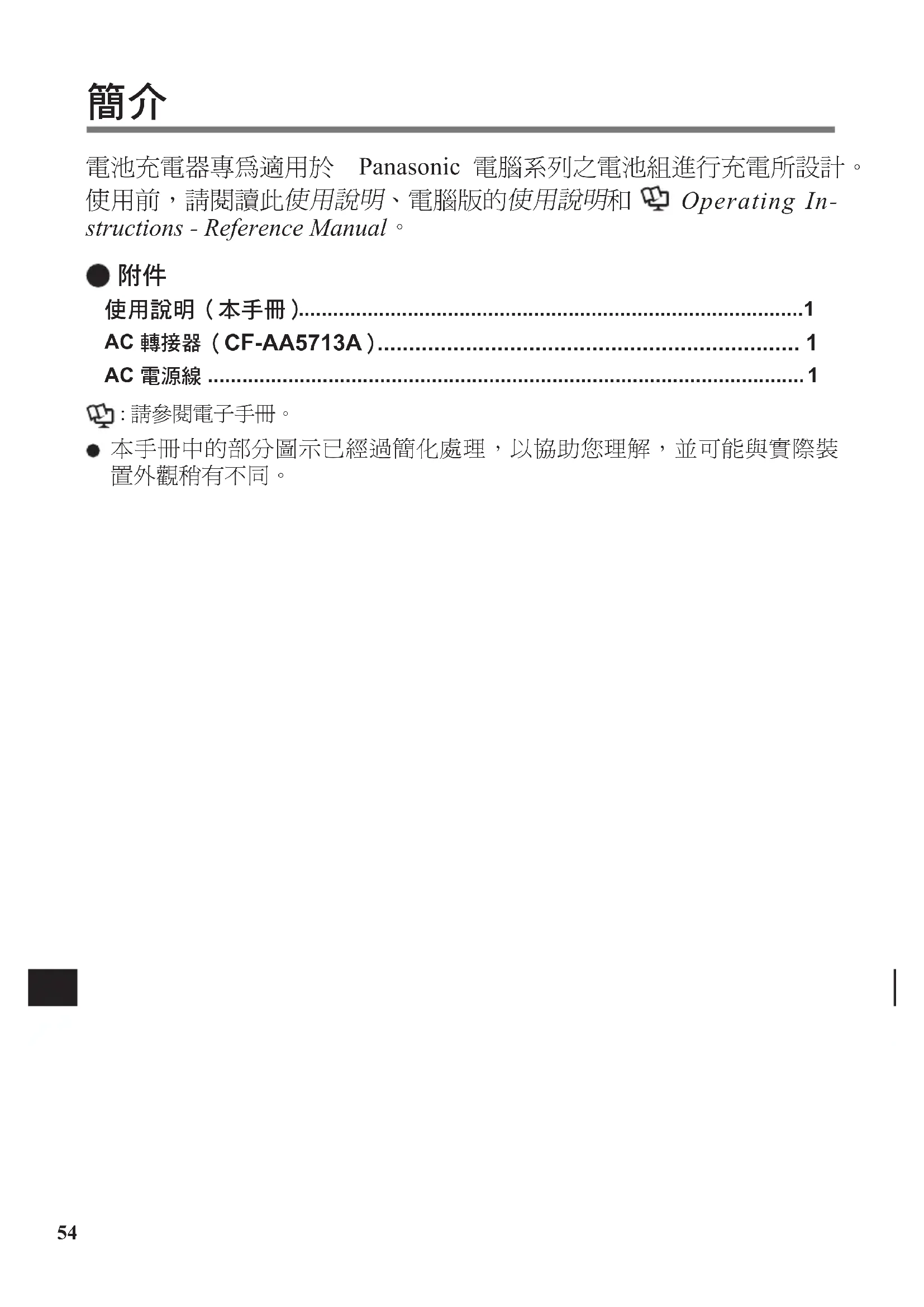 電池充電器專為適用於 Panasonic 電腦系列之電池組進行充電所設計。