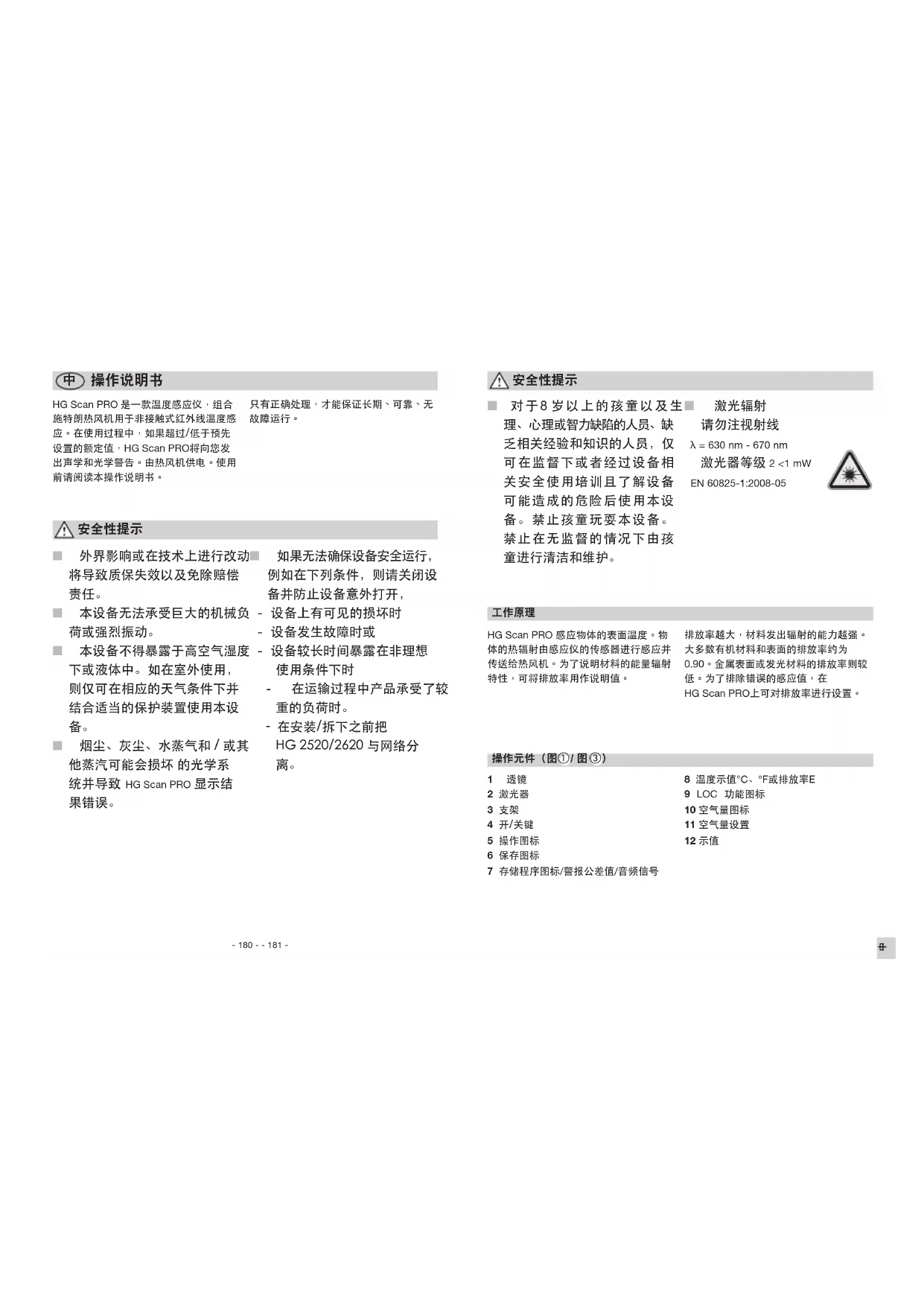 1 透镜2 激光器3 支架4 开/关键5 操作图标6 保存图标7 存储程序图标/警报公差值/音频信号8 温度示值°C、°F或排放率E9 LOC 功能图标10 空气量图标11 空气量设置12 示值HGScanPRO 感应物体的表面温度。物体的热辐射由感应仪的传感器进行感应并传送给热风机。为了说明材料的能量辐射特性,可将排放率用作说明值。排放率越大,材料发出辐射的能力越强。大多数有机材料和表面的排放率约为 0.90。金属表面或发光材料的排放率则较低。为了排除错误的感应值,在 HGScanPRO上可对排放率进行设置。